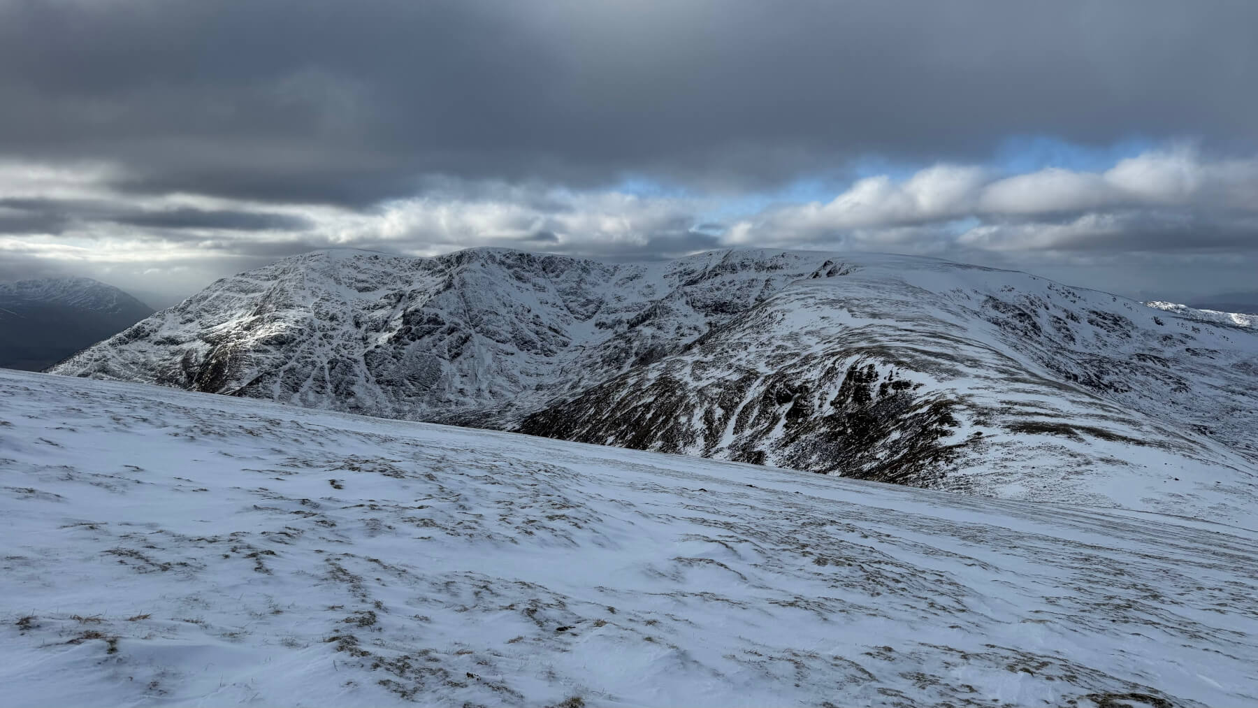 Today I walked over Bealach a’ Bharnish (between Creag Meagaidh and Beinn a’ Chaorainn) and had a wander around the upper NW slopes of Creag Meagaidh.
