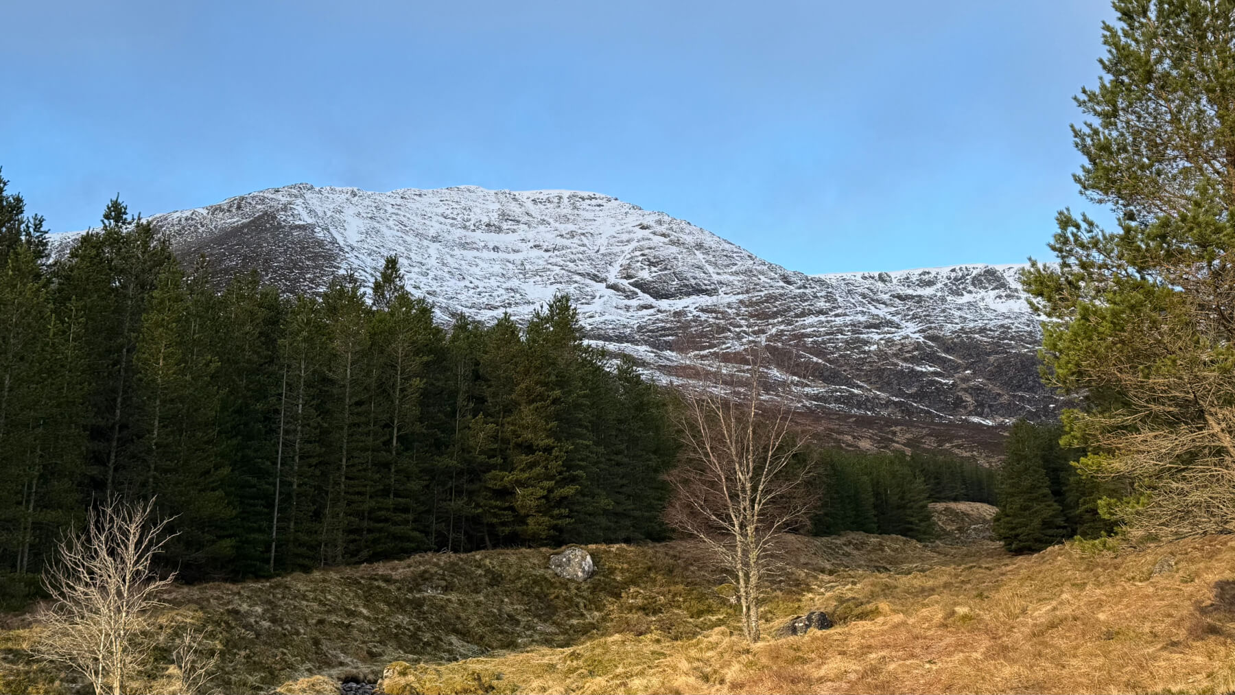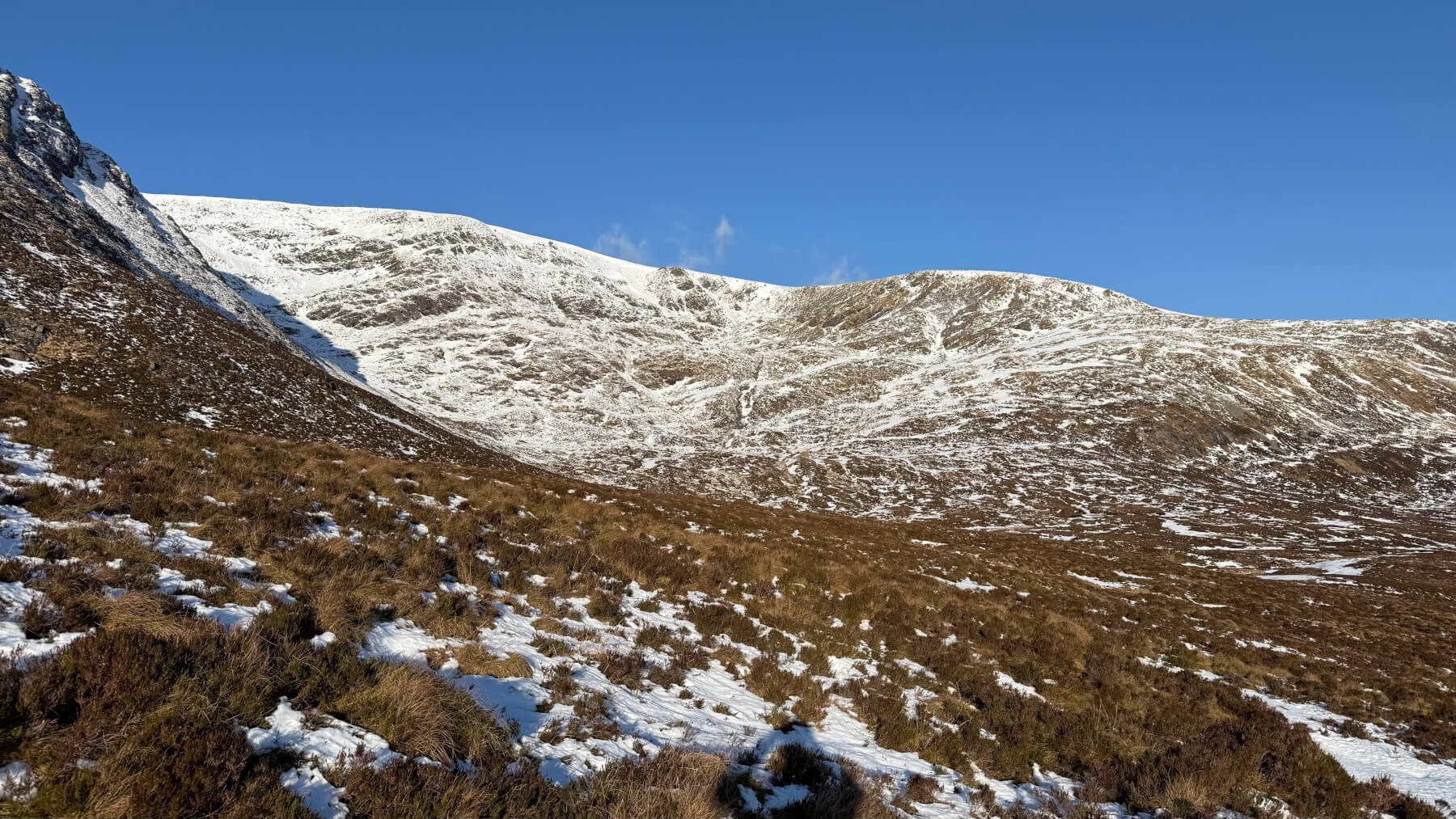 The Moy Wall snow line extends to quite a low altitude – possibly even further than shown in the photo – suggesting it must collect a reasonable depth of drifting snow which then takes longer to melt than the surrounding more open aspects.