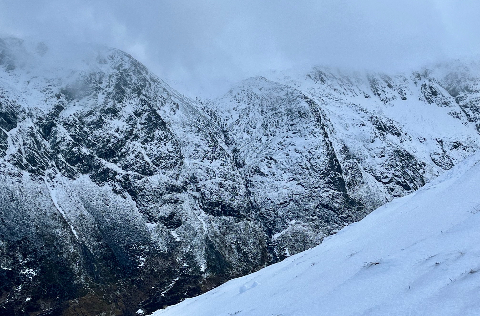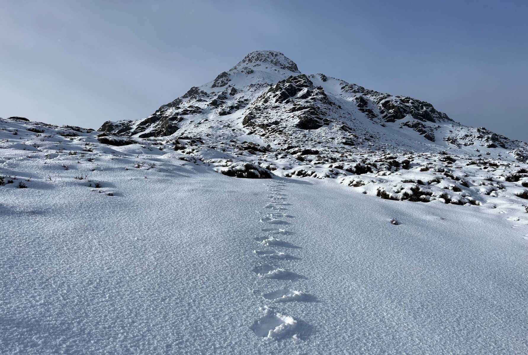 Walking through 2 – 3 cm of fresh snow heading up towards Lancet Edge on Sgòr Lutharn.
