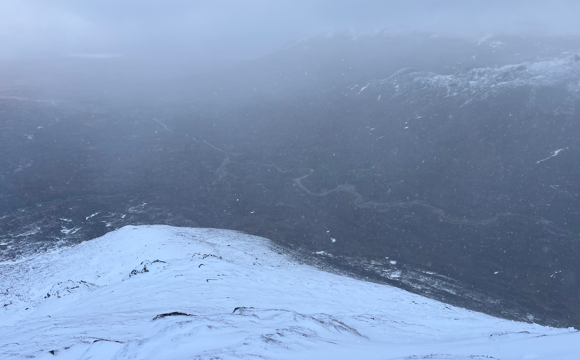 A passing snow shower … Loch Ericht can be seen in the distance.