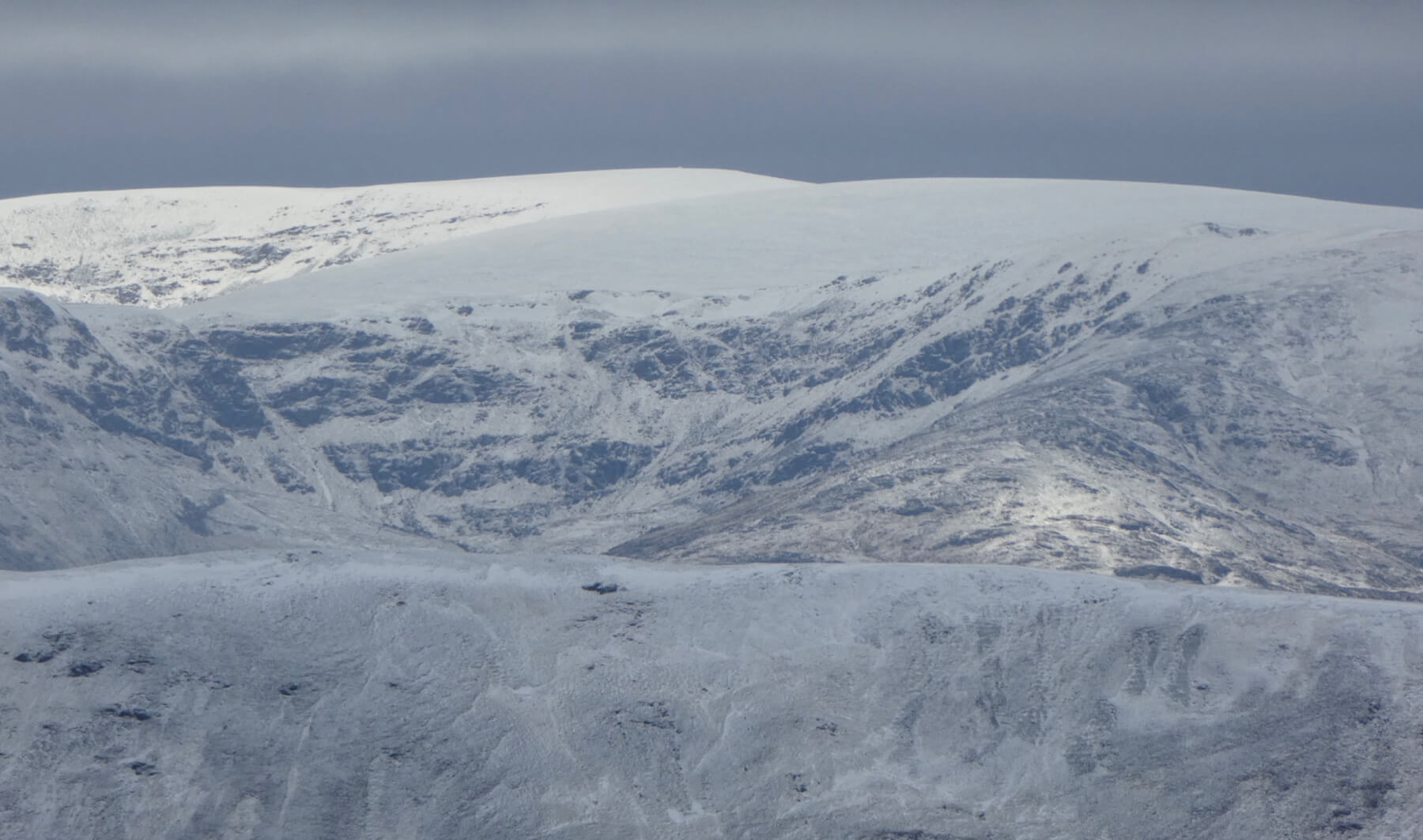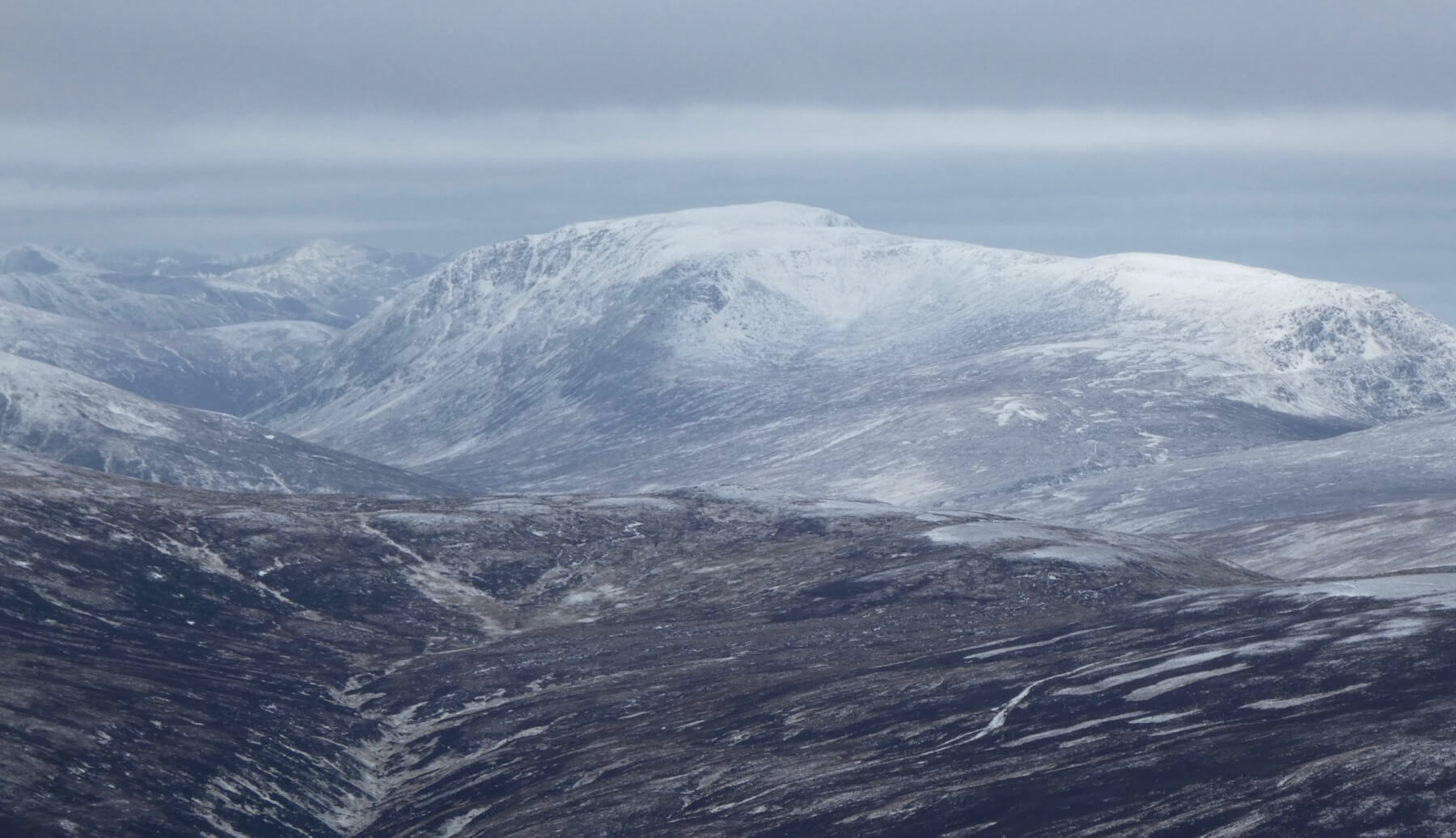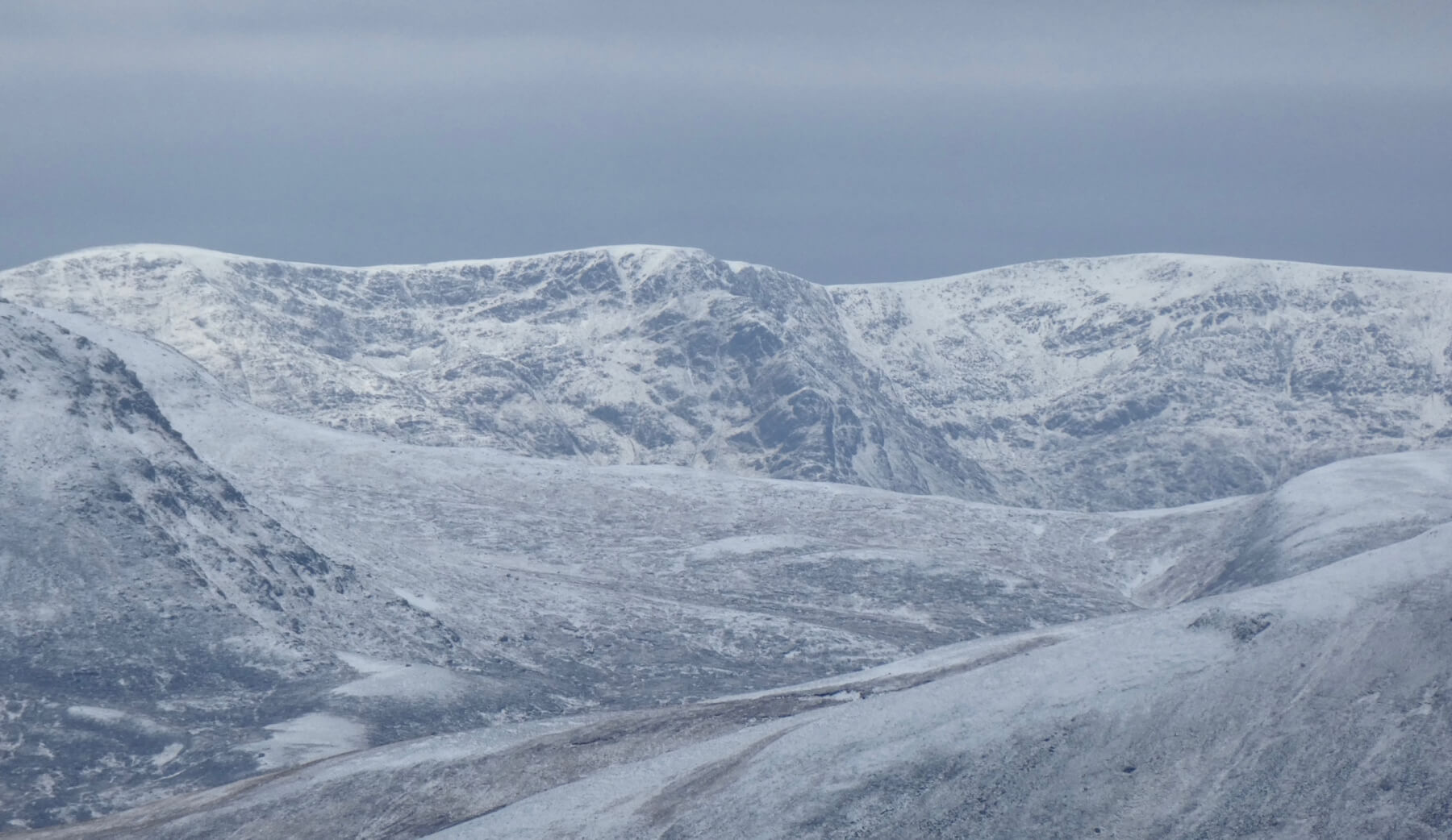 Ben Alder and the East facing coires of Garbh Coire and Garbh Coire Beag. The Long Leachas ridge is the right-hand skyline.
