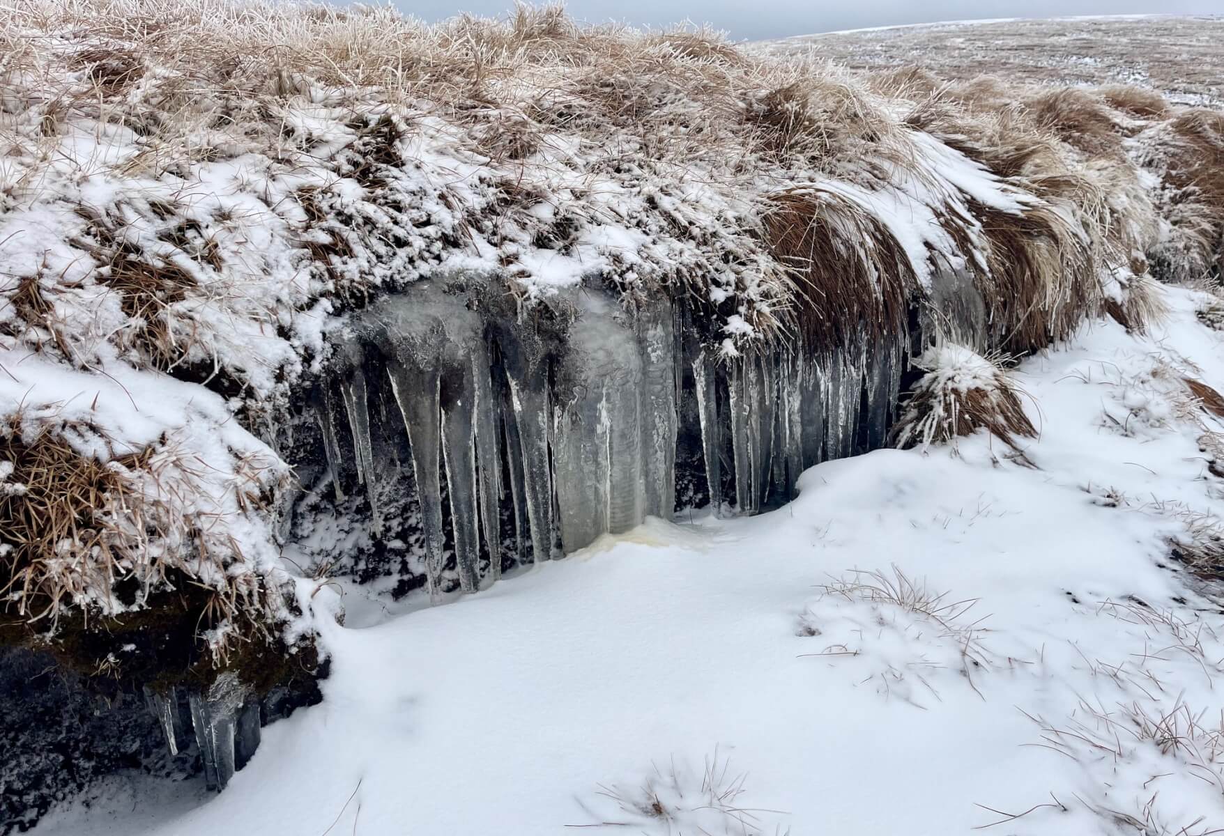 Continuing with the theme of cairns which have been on the blogs recently, although this one isn’t actually on a summit. The hills in the distance (Creag Meagaidh summit just catching the sun in the background) look white and wintry, however the foreground gives the true picture – a light covering of snow with lots of heather and grass poking through. Evidence of light drifting here too with snow deposited on the wind sheltered side of the cairn, and also on the wind sheltered side of the grassy hummocks.