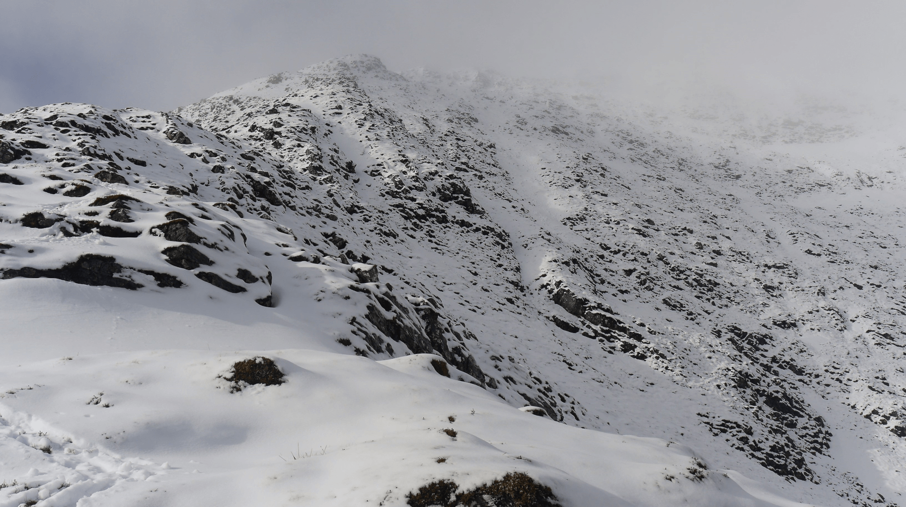 (Above) In to Beinn a Chaorainn today via its most southerly East-facing ridge, the one often used as a descent route for ascentionists of the ever-popular East Ridge. Wet or moist snow here from the snow line at 800m up to just beyond 900m. General cover is superficial, maybe 10cm here in the photo? Only a little new drifted snow near the summit which was bonding up well in temperatures close to 0 degrees C. Some new cornice development but not much, however there are pre-existing older cornices in place over steeper N to E aspects above 1000m.