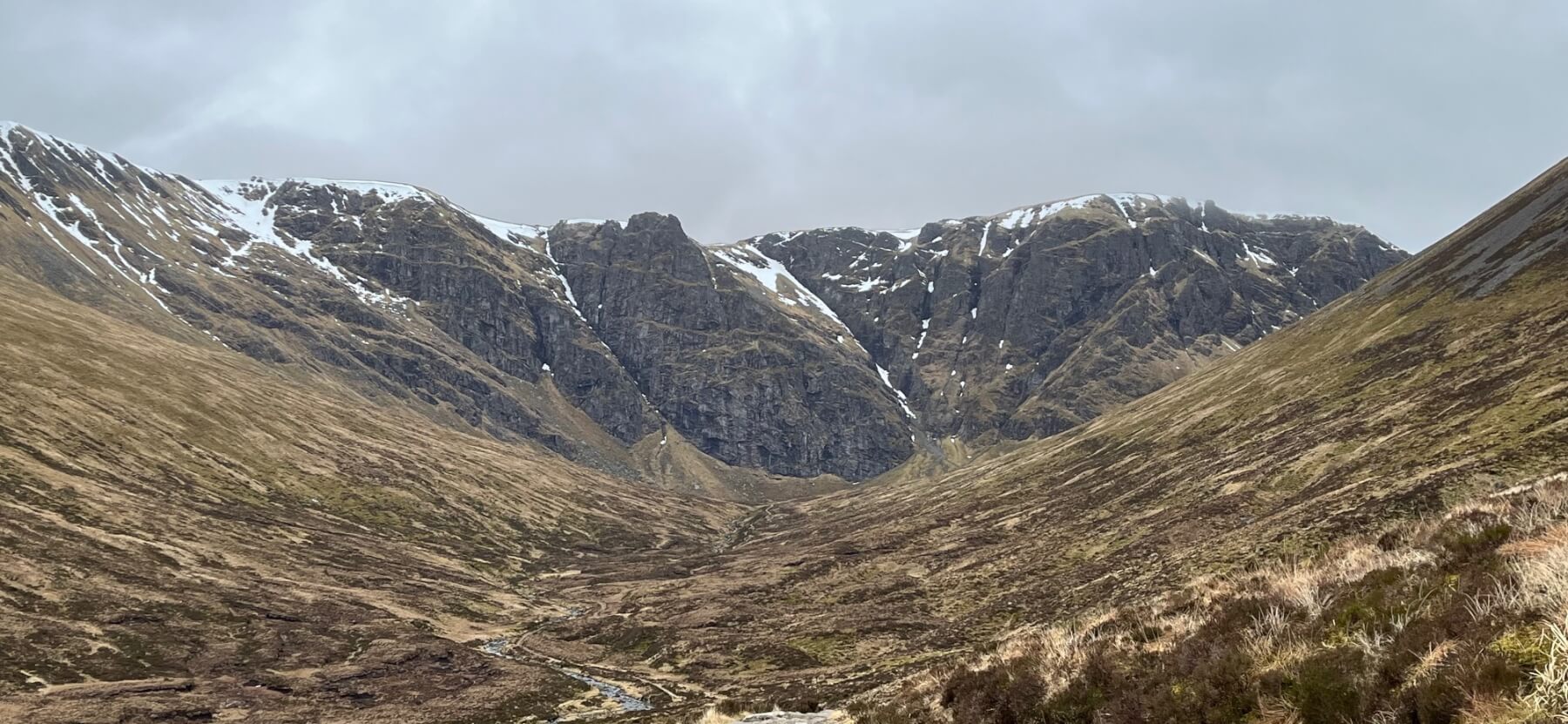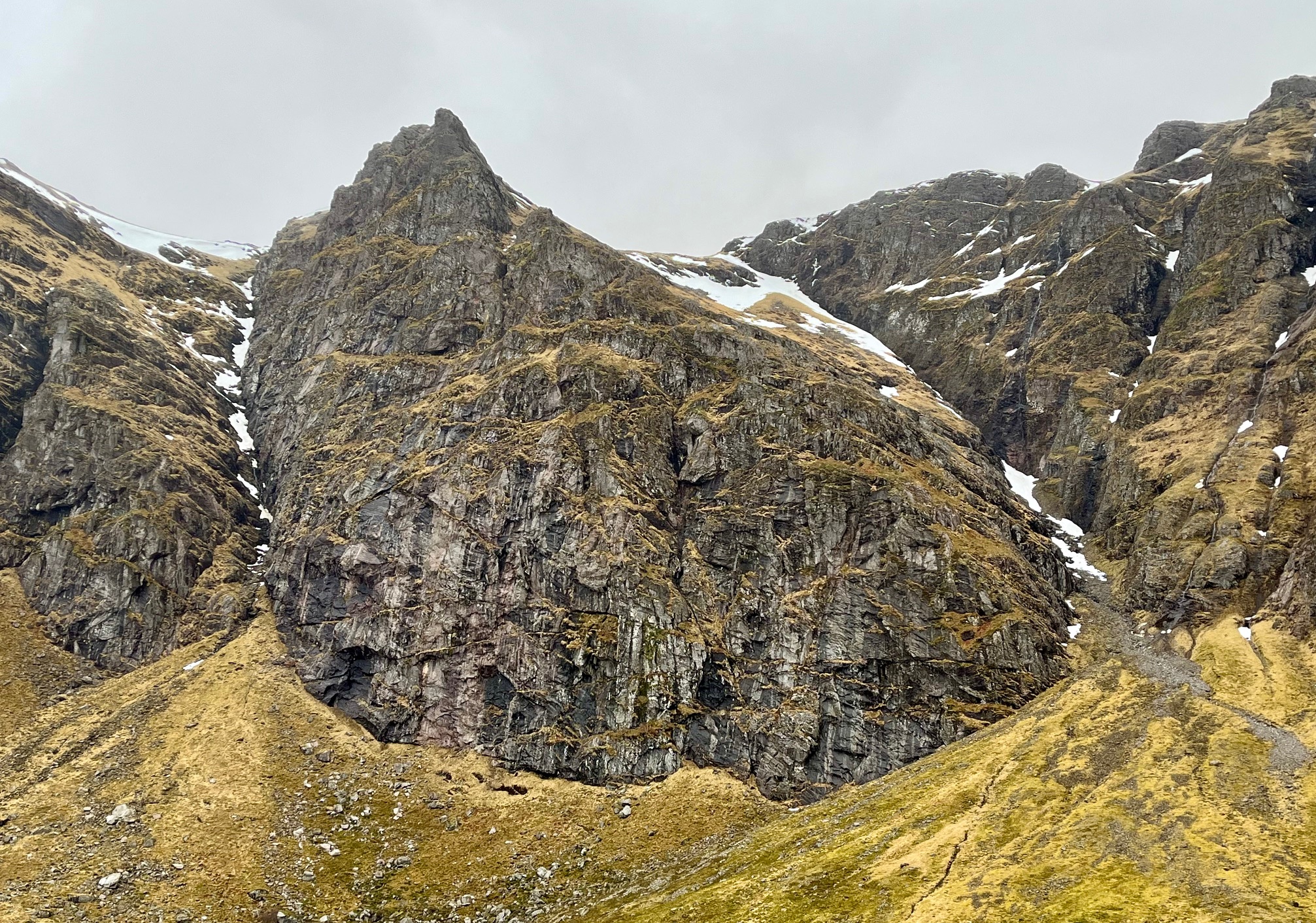 The Inner Coire with the strip of remaining dirty snow on the right coming out of ‘Cinderella’. Some small cornices above have survived the thaw.
