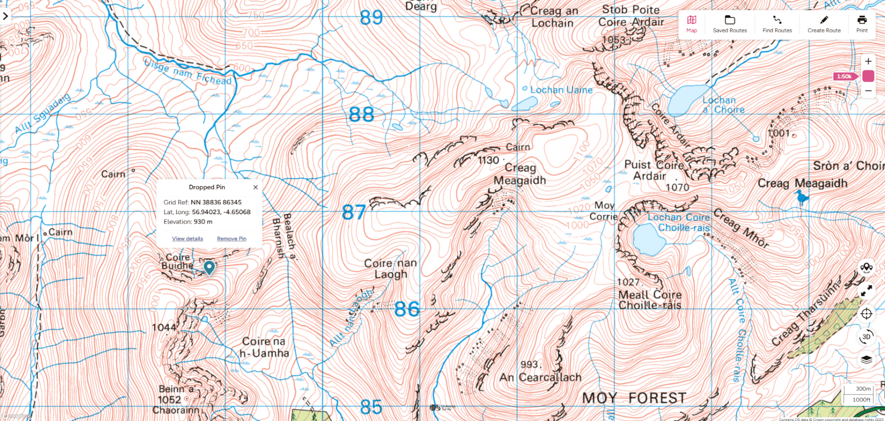 (Above) A view from the map ‘pin’ towards The Window (hidden) and Stob Poite Coire Ardair 1053m. If you zoom in you should be able to make out a sunlit camel-train of hillwalkers ascending/descending close to an old vehicle track. Didn’t see a single person where I was just 4.5km away.