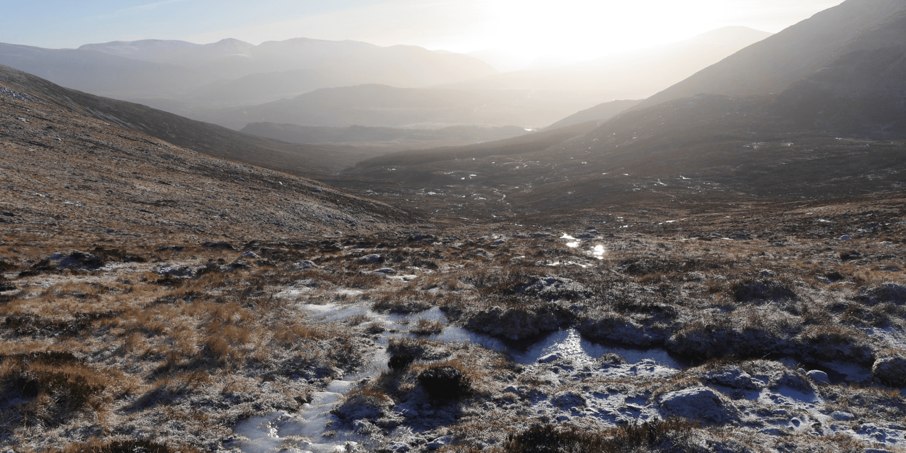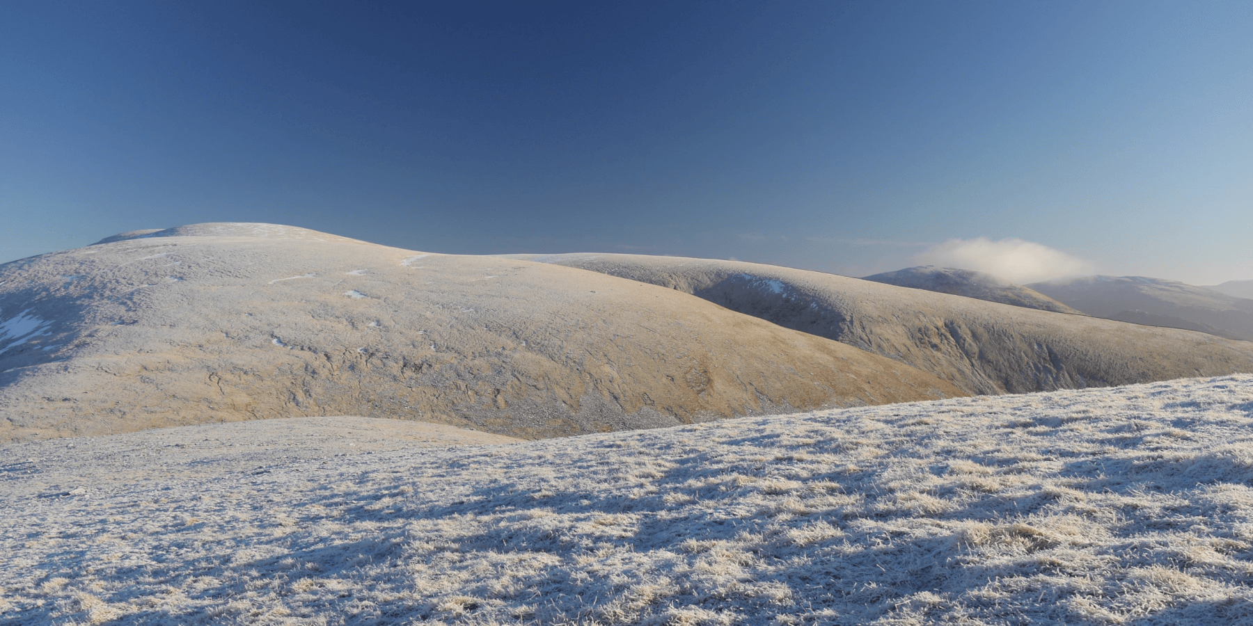 (Above) A shot across the SW shoulder of Creag Meagaidh summit from high above Bealach a Bharnish lower left of photo. The Moy Wall is visible and forms a hard outline on the skyline of one of the broad ridges right of centre. Difficult to see because of the widespread frost but old snow patches are present on the Creag Meagaidh summit plateau, are of modest size and dissected by swathes of vegetation.