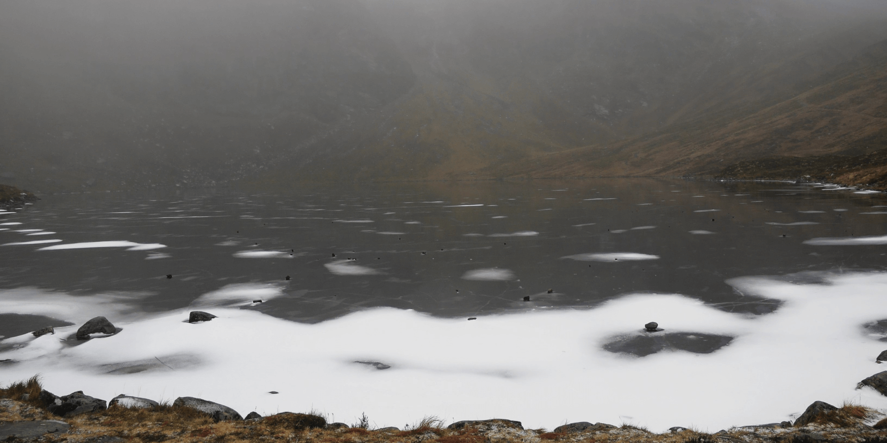 (Above) Lochan a Choire at the head of Coire Ardair. Frozen again and with a little drifted snow at the foreshore – the site of today’s technical snow pit!
