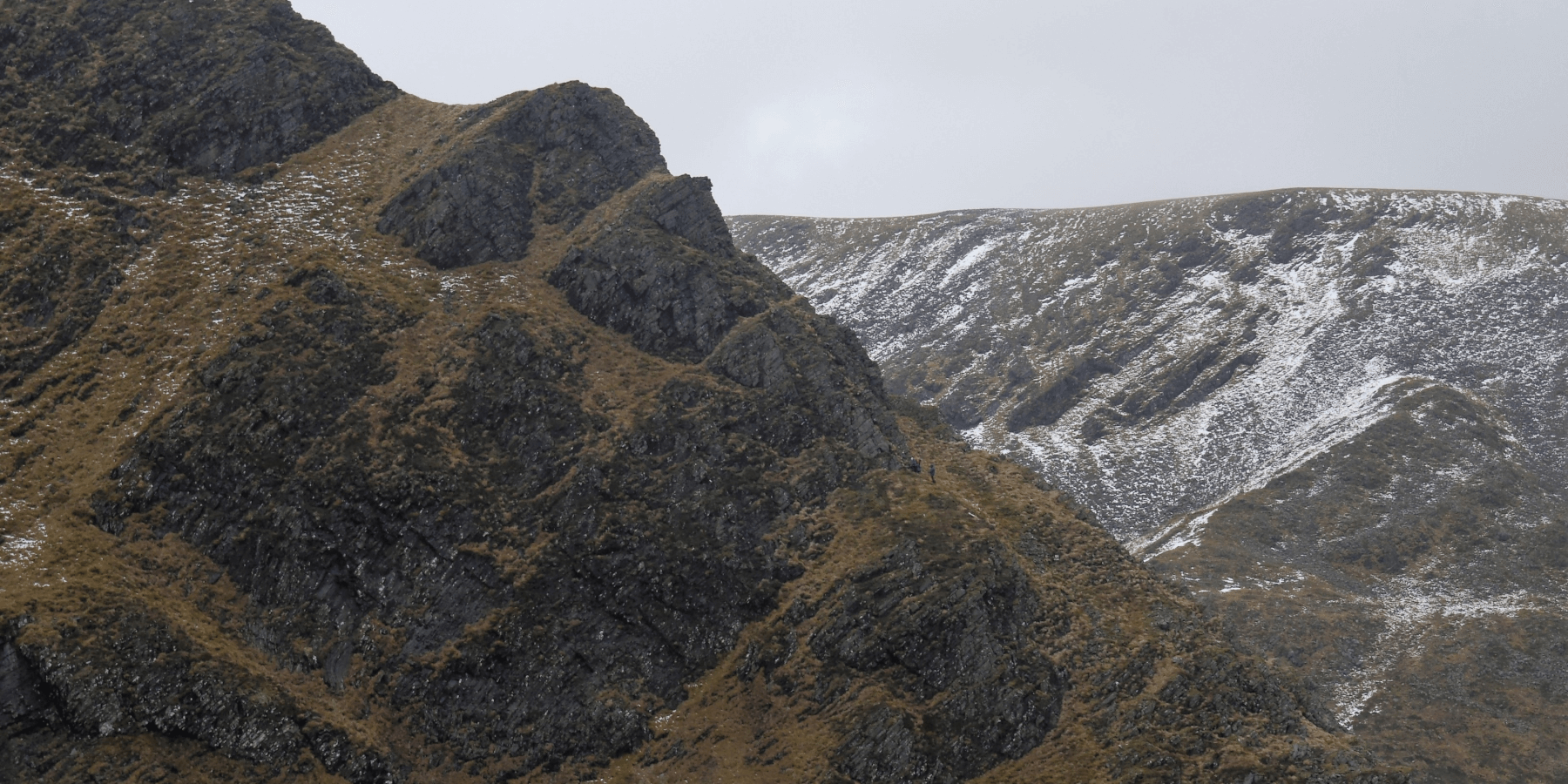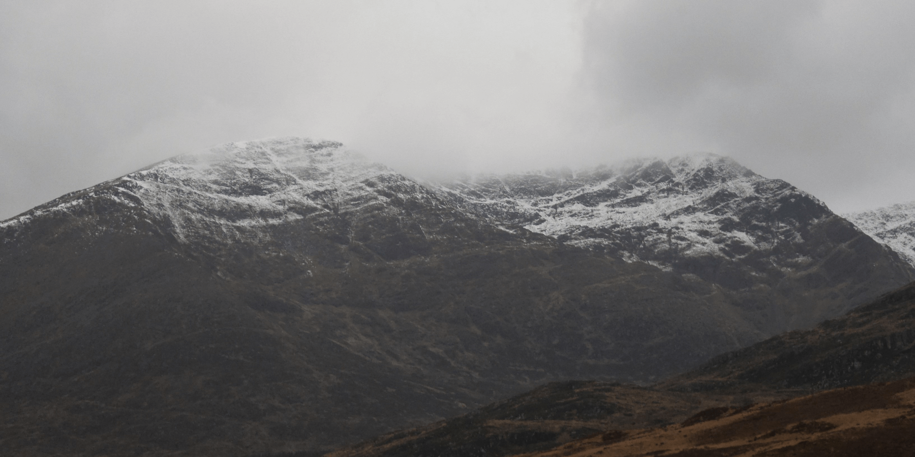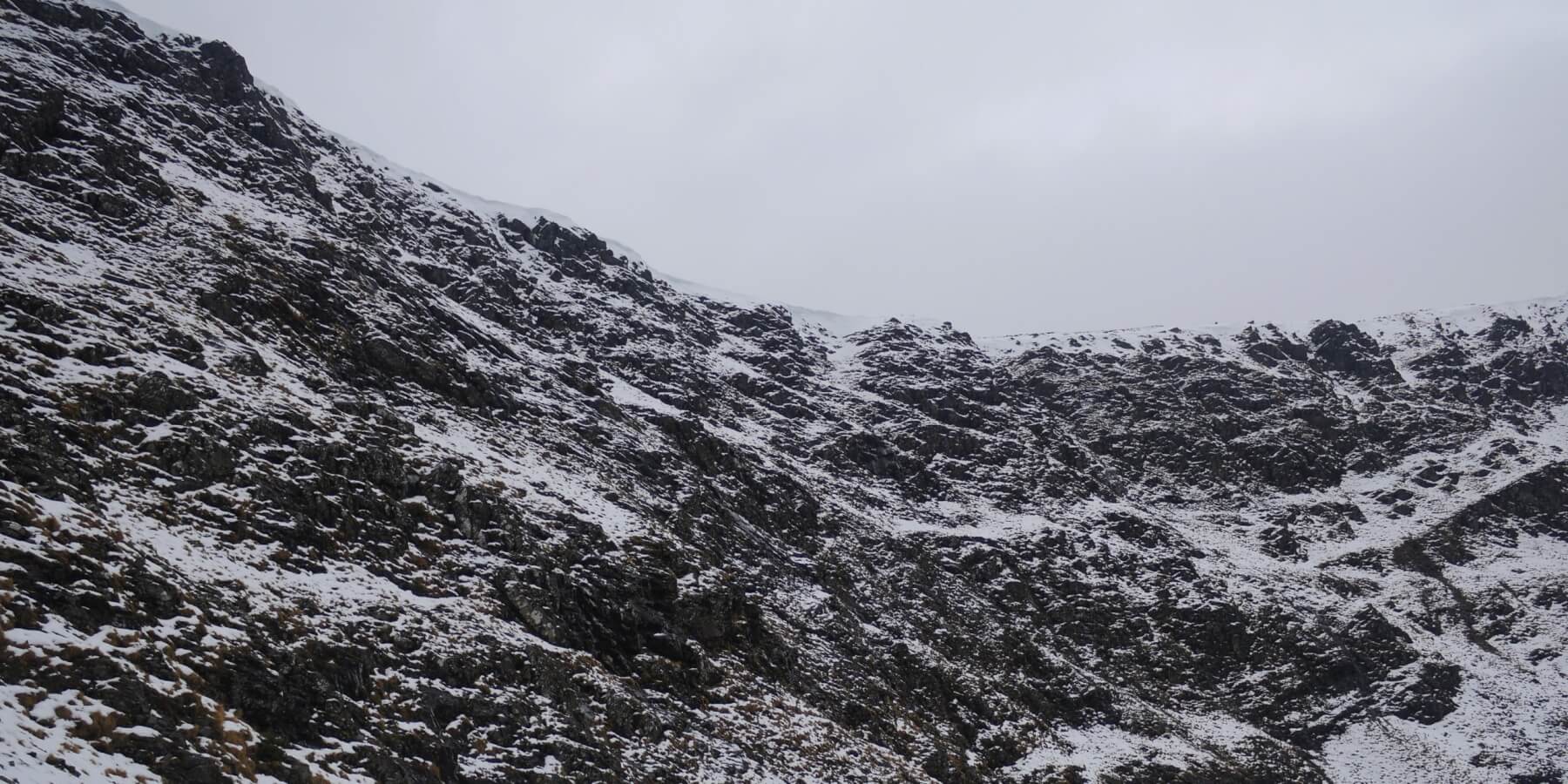 (Above) A misty view across to Geal Charn 1132m and Aonach Beag 1116m with Coire na Coichille. Looking a little more wintry over there compared to Beinn a Chaorainn.