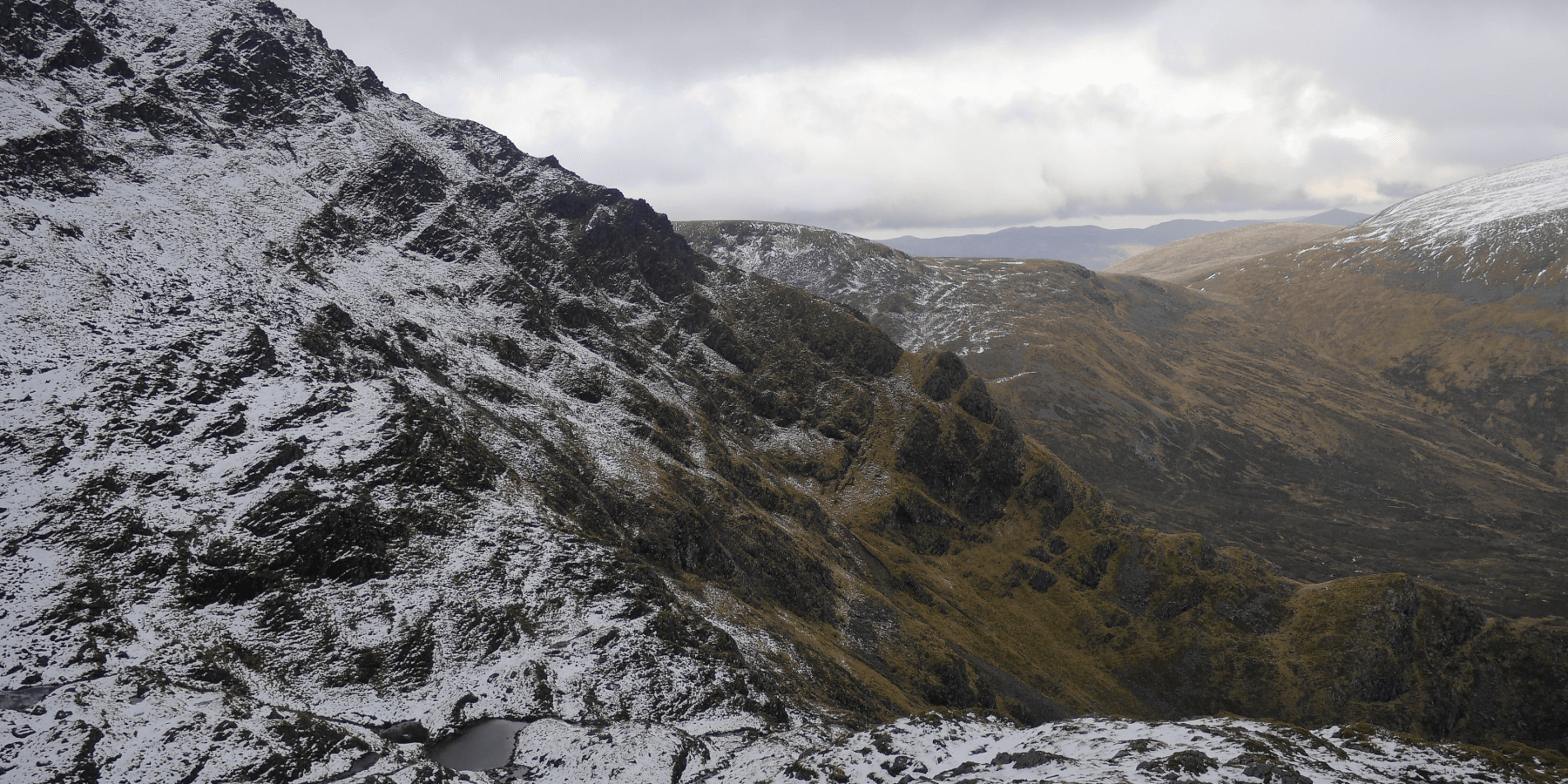 (Above) Looking across to part of the Creag Meagaidh plateau – with the line of the Moy Wall prominent – and Loch Laggan on the right.