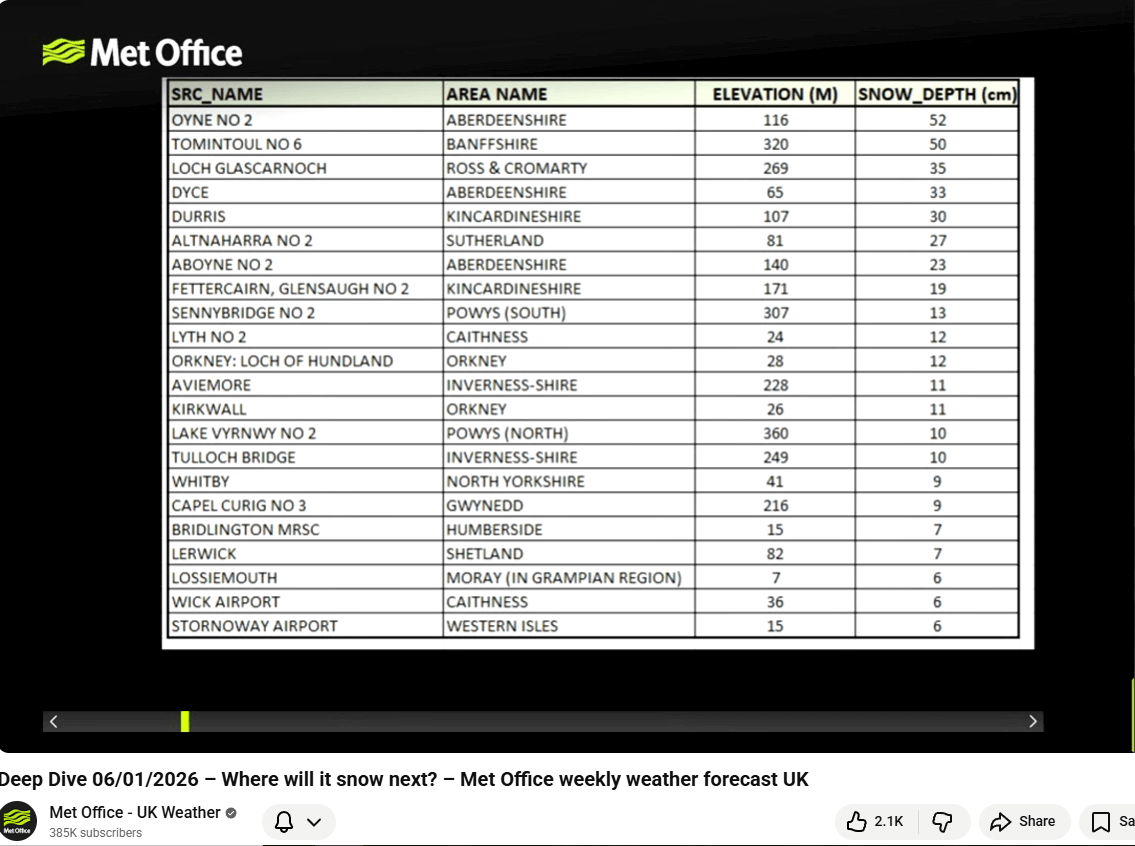 (Above) Screenshot of a table of ranked official snow depths at a selection weather stations around the UK. Tulloch Bridge is just 5km away from Beinn a Chaorainn – the western end of the SAIS Creag Meagaidh forecast area.