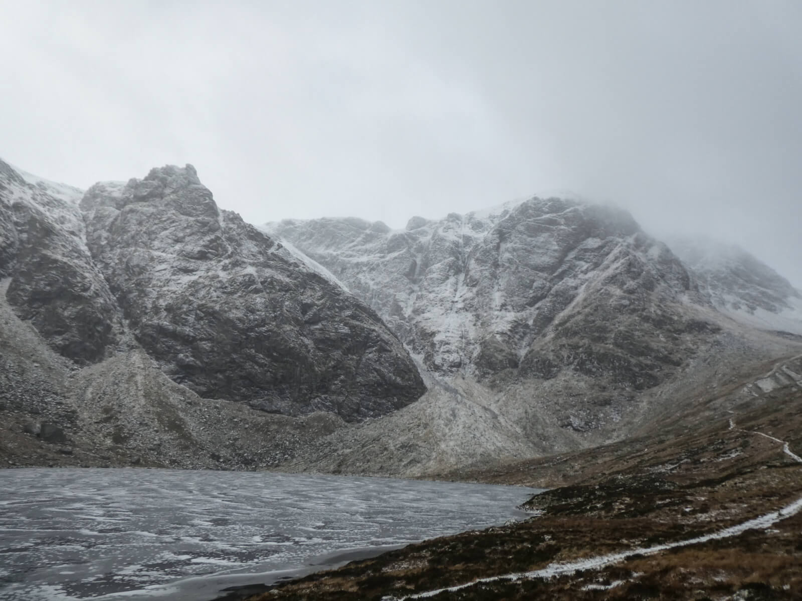Visibility was generally poor today, although this image was snatched in a brief clearing around midday. Coire Ardair is still fairly devoid of snow. However isolated windslab around the coire rims and in the gully tops is sensitive and laden with instability. A very different picture awaits on the north side of ‘The window’ where there are greater amounts of snow, perhaps due to the altitude and the upslope orographic effect on the approaching North-Westerly flow?