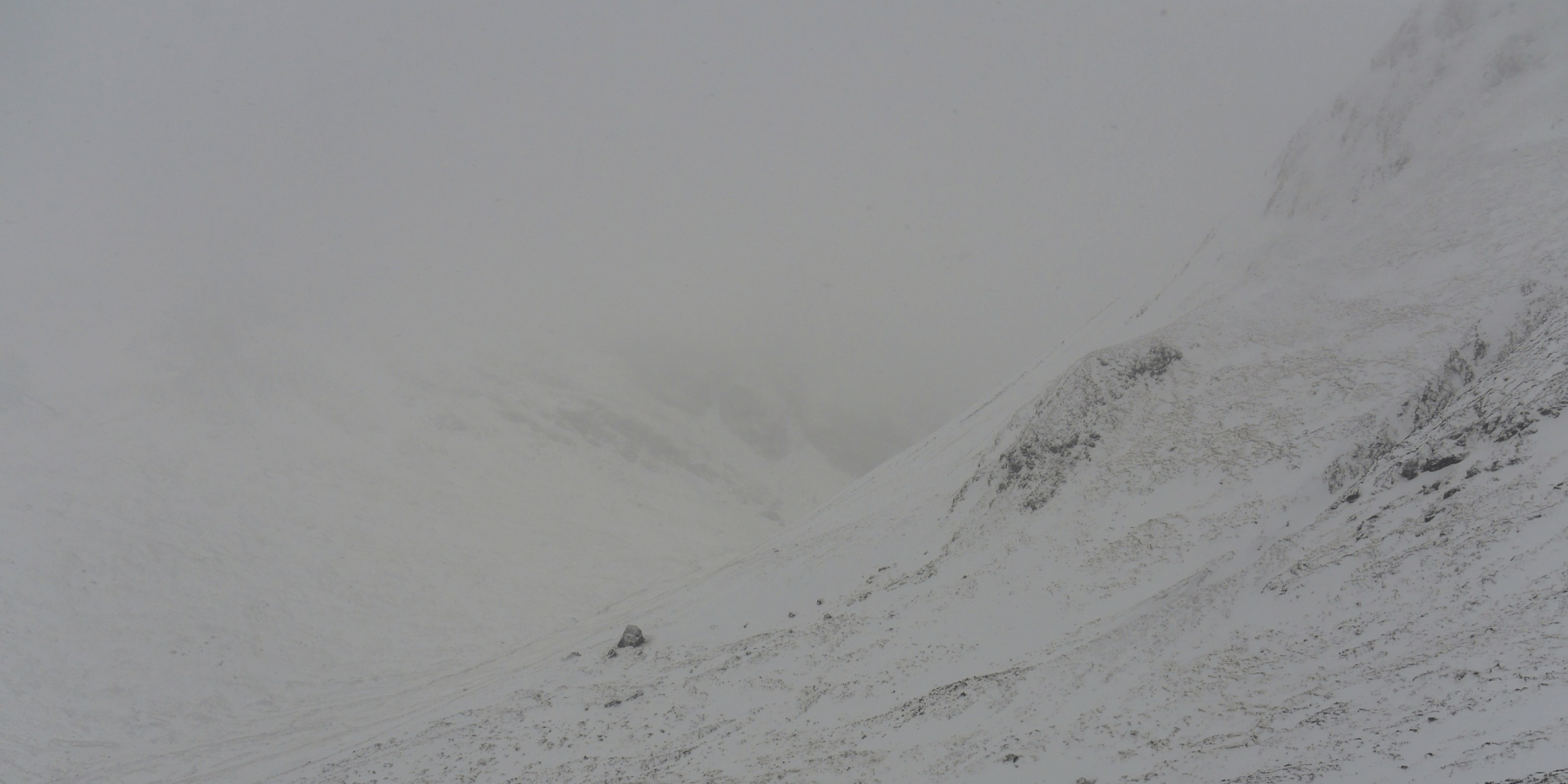 (Above) A view towards the crags of the Post Face at the top end of Coire Ardair from high in Coire Chriochairein. Above this altitude visibility declined to a few dozen metres for the whole morning.