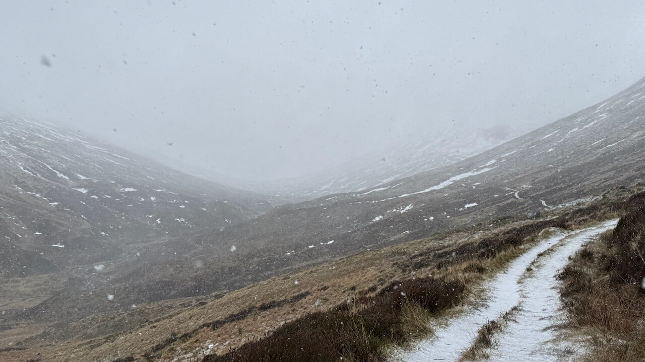 A very windy day gusting 40mph or so on the approach track in Coire Ardair. Winds and and heavy snow will continue overnight, calmer and mostly dry for Wednesday. Would be nice to get a view someday!