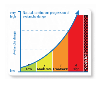 (Above) The European Avalanche Hazard Scale. Progression of avalanche danger against categories. Contrary to what quite a few winter hill-goers think it’s definitely not a simple linear progression! For more background check out this link: https://www.avalanches.org/education/avalanche-danger-scale-2/