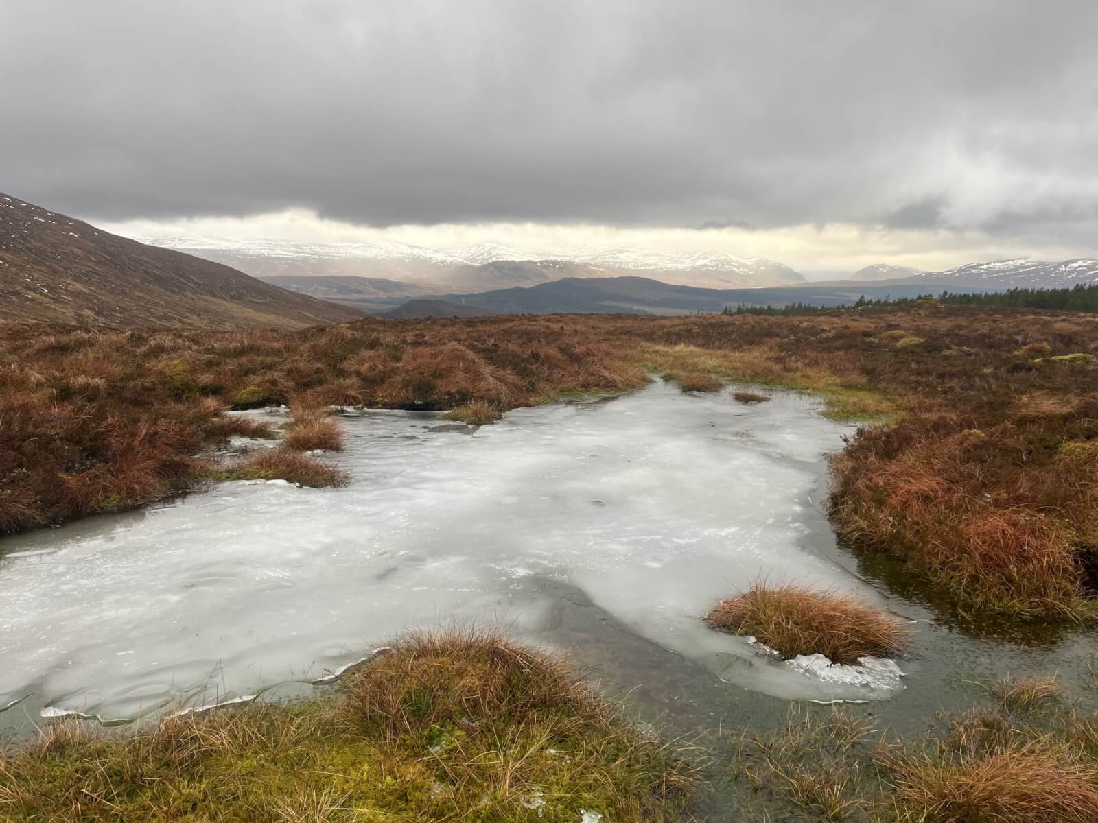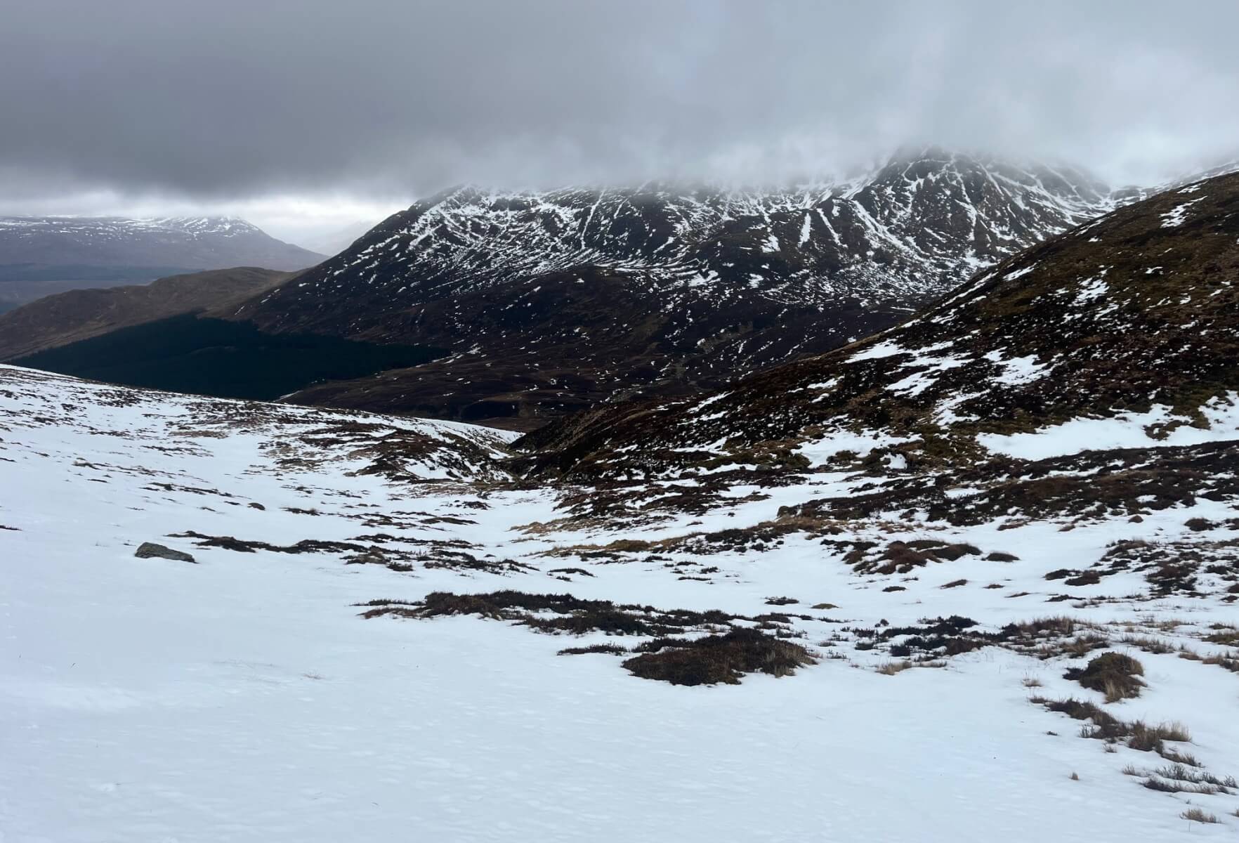 Rain and generally wet ground at 600 metres. Some ice clinging on here but you wouldn’t want to step on it. The lower slopes of the hills south of Glen Spean are showing beneath the cloud base.