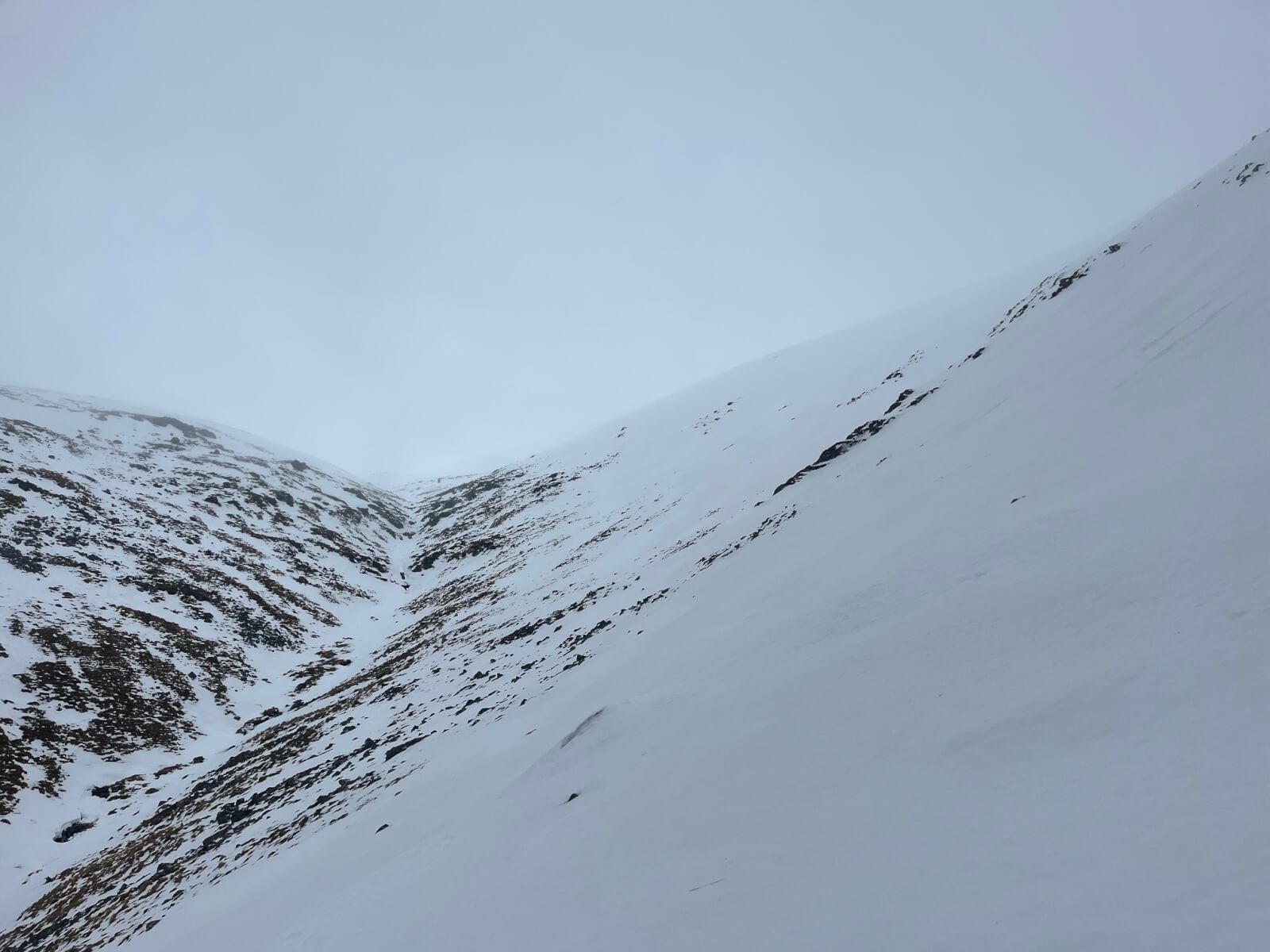 Allt na Laogh and the West facing slopes of Coire nan Laogh. This was as good as the visibility got. The snowpack here is moist.