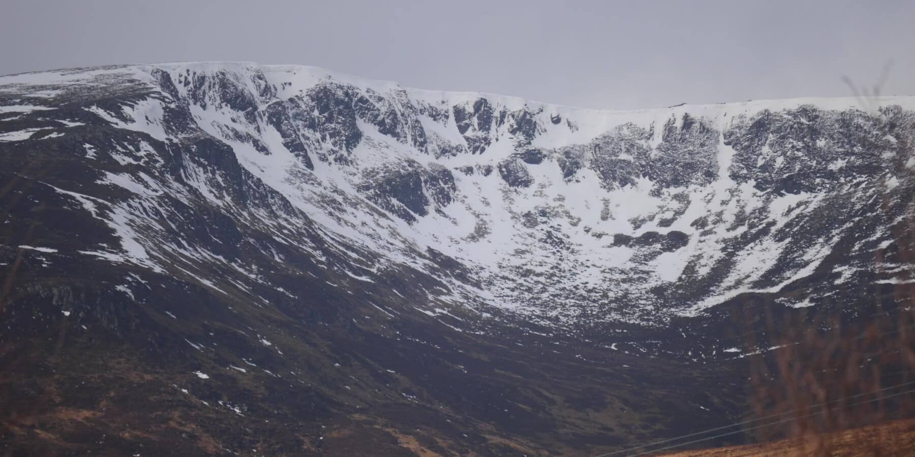 (Above) It cleared and dried up a tad in the afternoon enough to capture a reasonable shot of Coire Dubh, an east and south-facing coire part of the Carn Liath massif. Top of the hill here is at 916m and only a modest amount of recent snowfall at this altitude, the bulk of being rainfall/sleet.