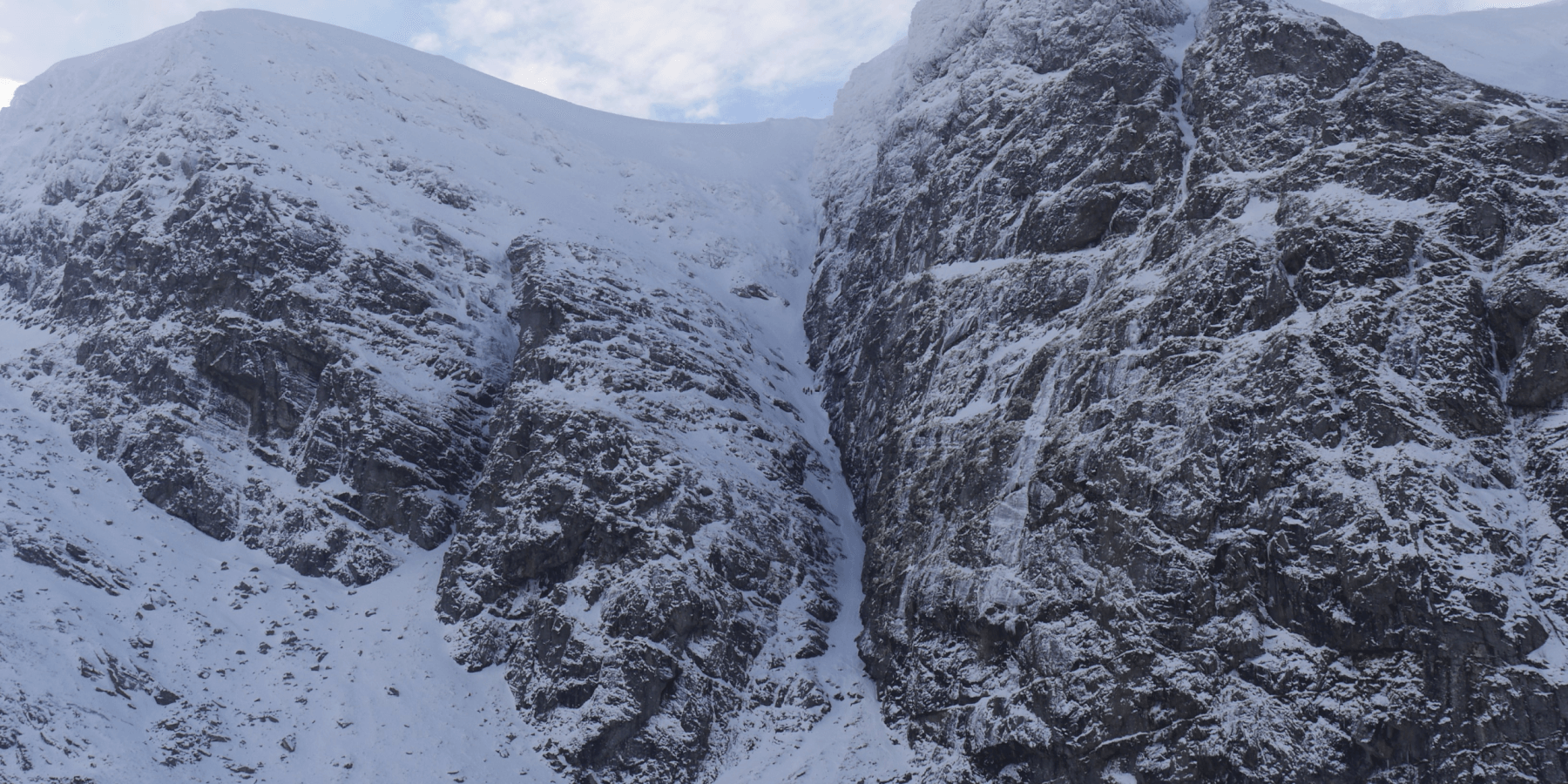 (Above) Avalanche crownwall and debris at the western end of the The Window. Probably came down on Thursday after persistent drifting. Some possibility that it was remote triggered (see below) but likely very few people would have been wandering around here during yesterday’s maelstrom. The jury’s still out on this one. The debris at the bottom of the photo had been partly drifted over then scoured so was not easy to identify at first glance, leaving an esker-like mound in the bottom of the bealach.