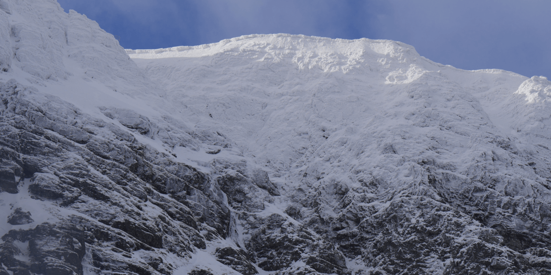 (Above) Much wind-denuded East-facing cornice line above ‘Cinderella’ in the Inner Coire. Cornices here were of comparatively modest size but may see some new growth on Friday then a period of weakening as the mild summit temperature take hold.
