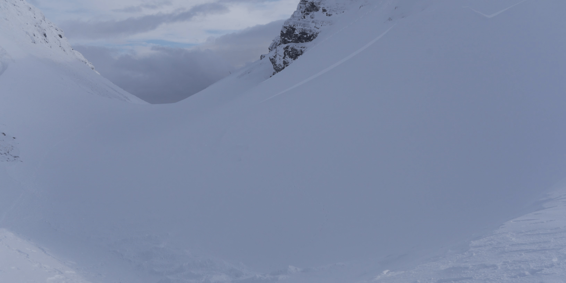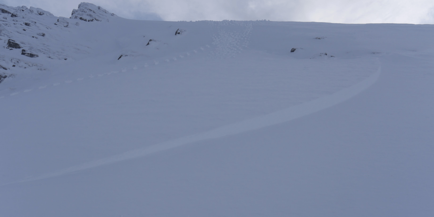 (Above) Raised footprints above part of the crownwall. The failure layer was one composed of partially facetted grains, though today this layer had ‘recovered’ a bit and produced clean but quite resistant shears. Size 1 avalanche on a NNW aspect at 970m. 80m crownwall, varying from 35cm to 10cm high.