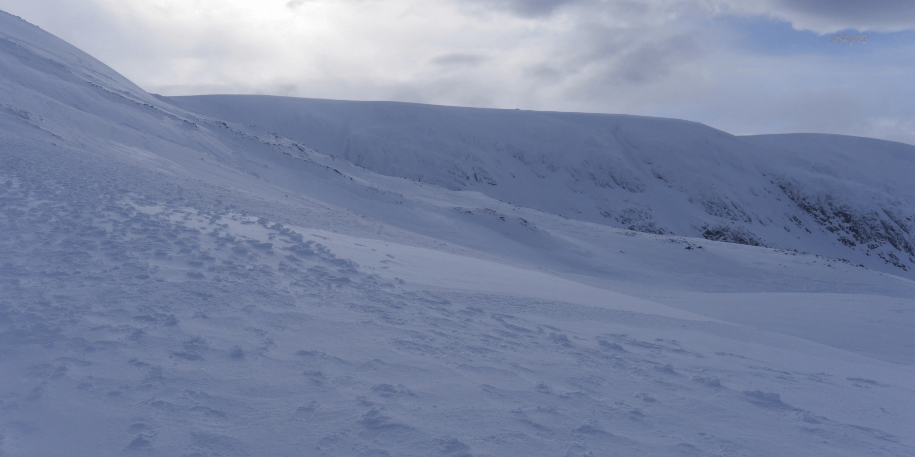 (Above) The back side of Creag Meagaidh summit with Mad Meg’s cairn visible on the horizon.