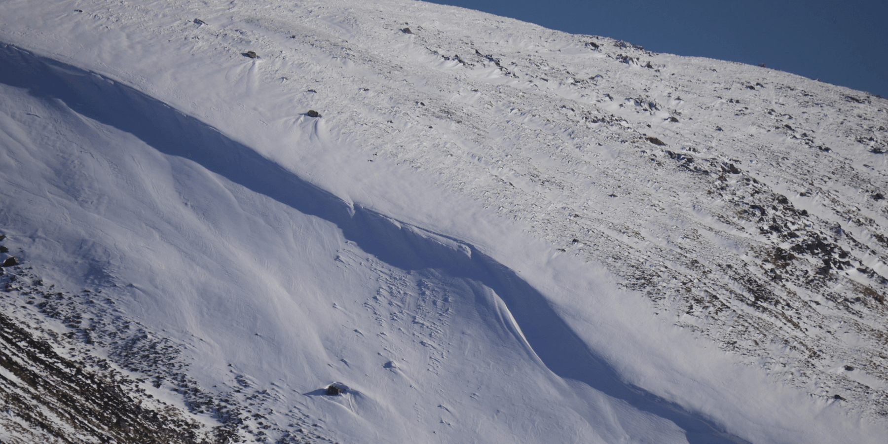 (Above) Cornice debris on a W aspect from an event in excess of a week ago after there had been persistent drifting on SE winds.