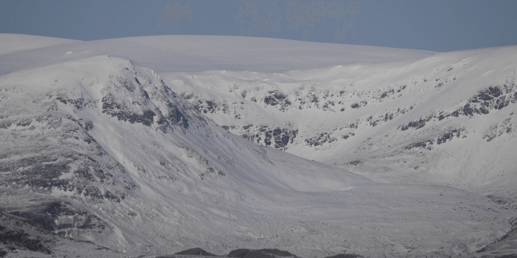 (Above) Inset of the Beinn a Chaorainn’s East Ridge. Two winter mountaineers visible atop the ridge line.