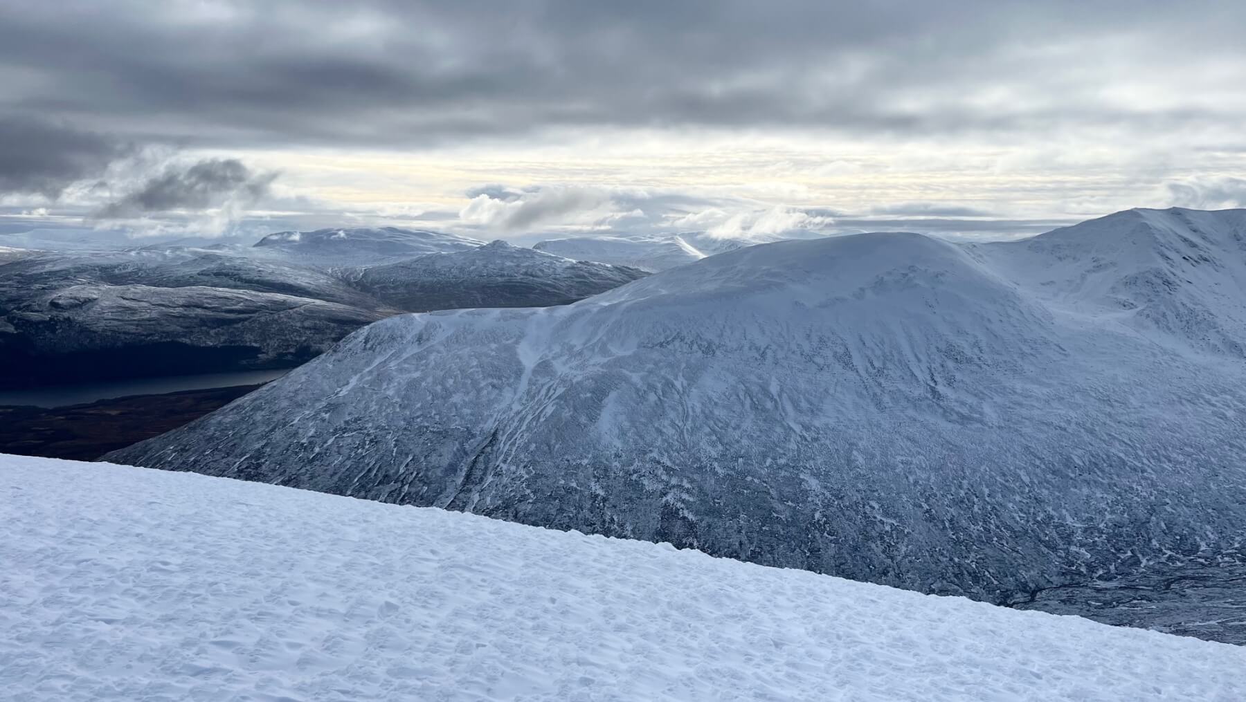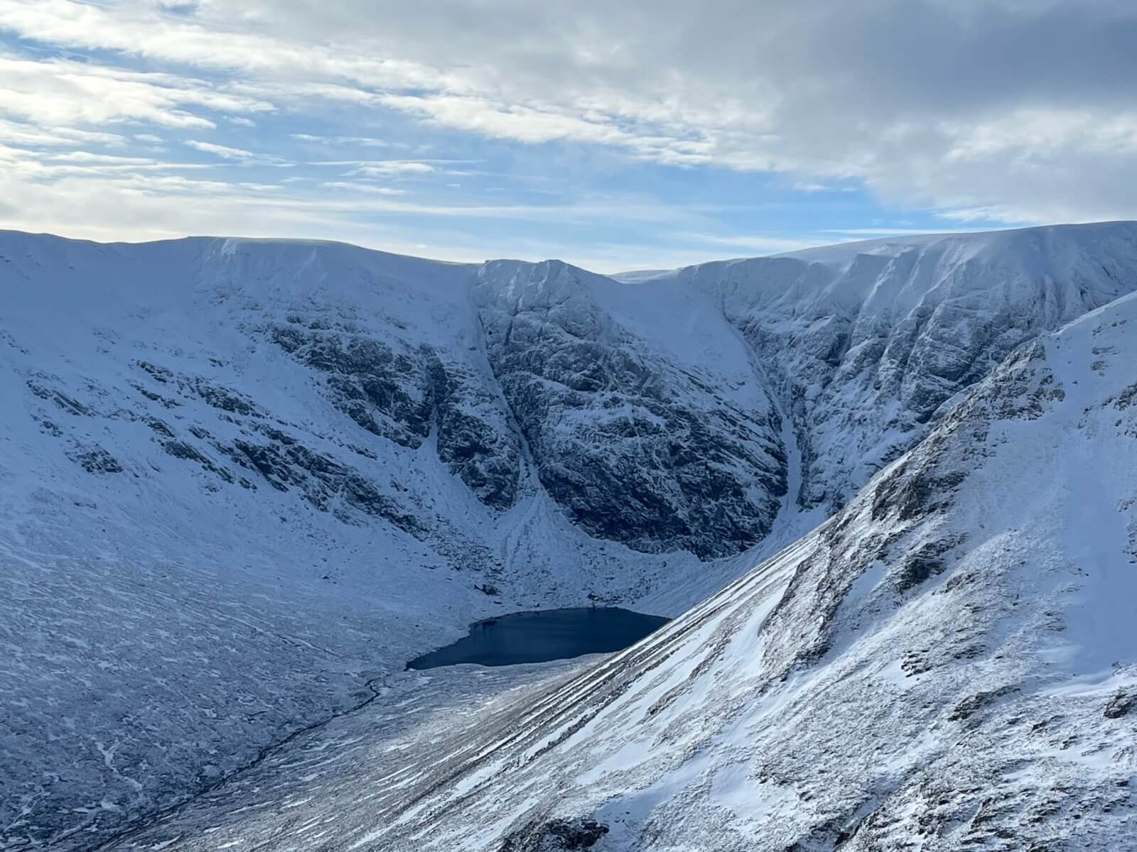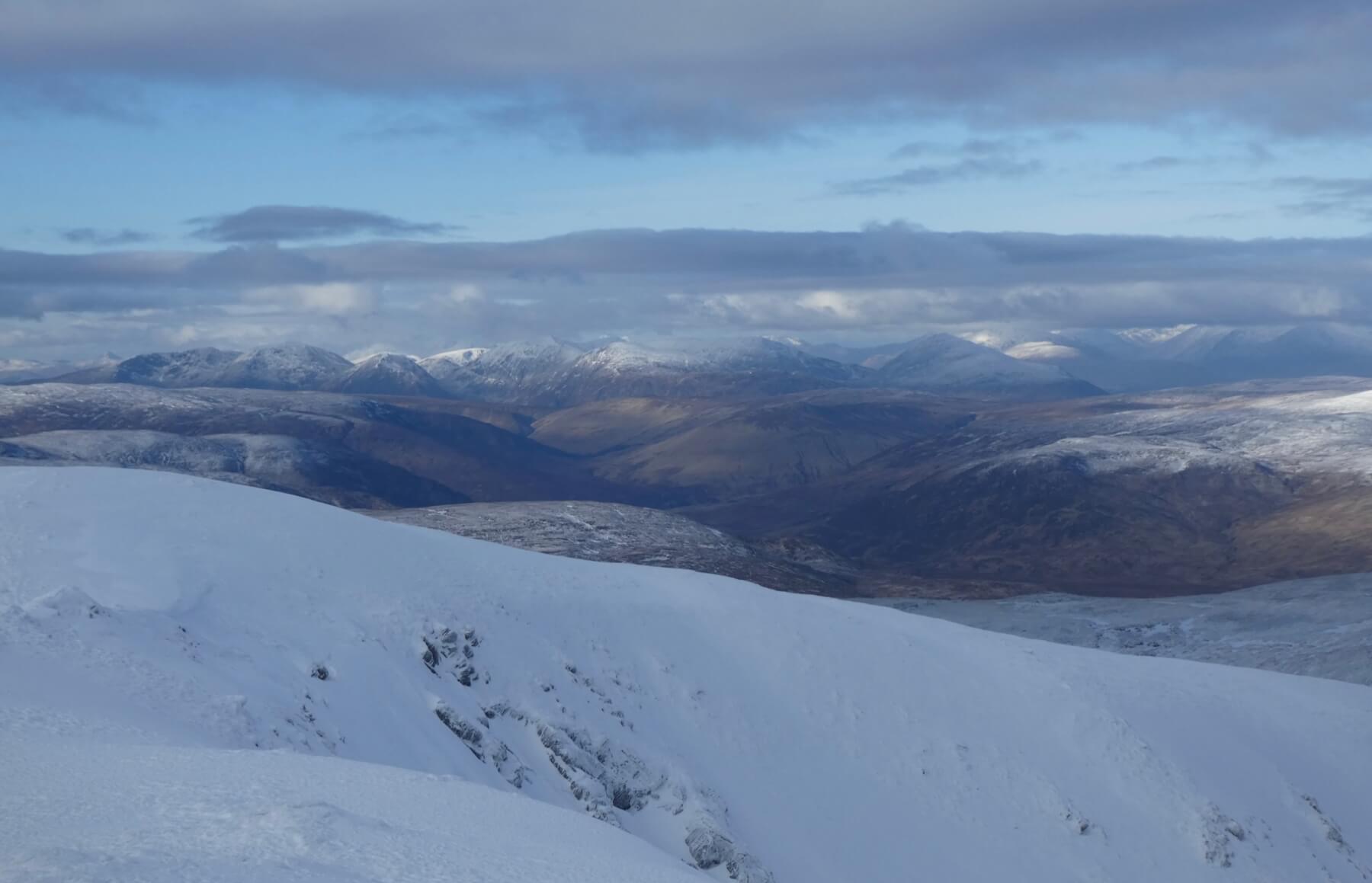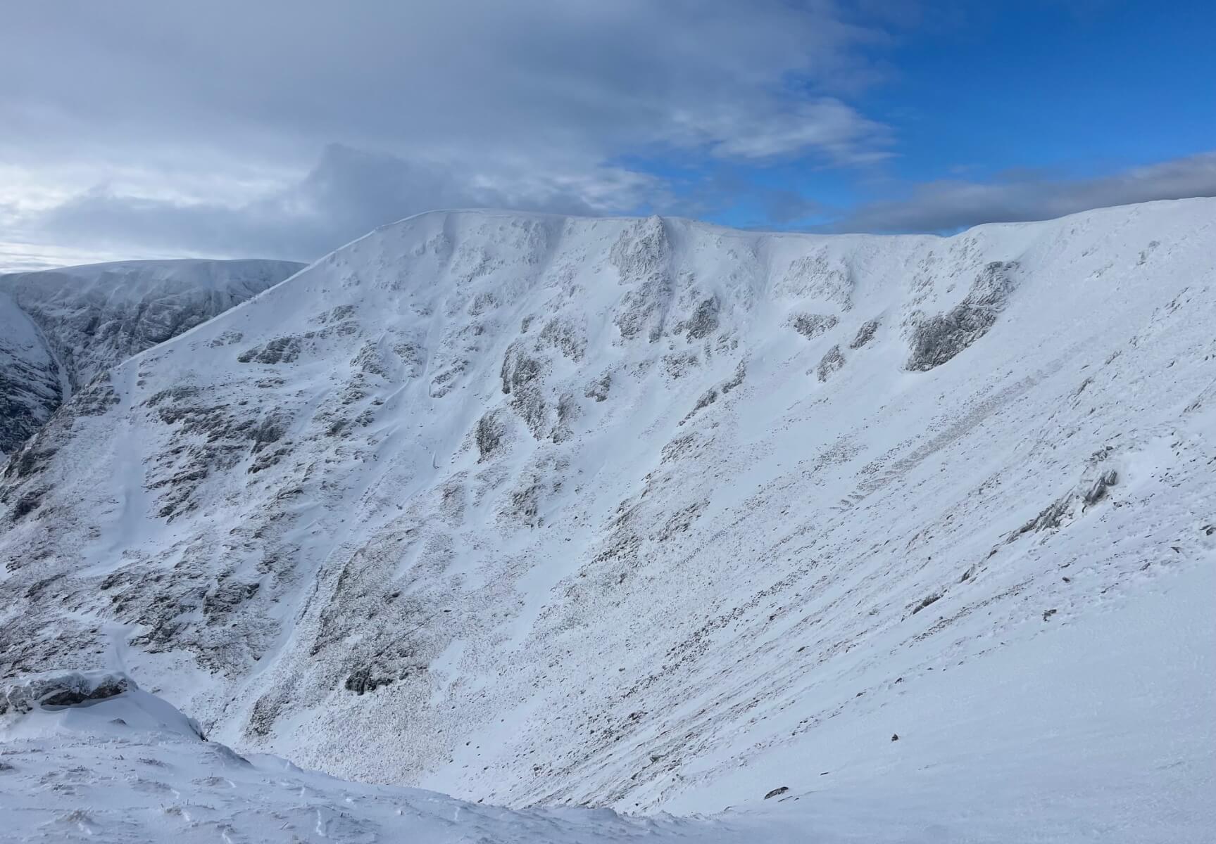 Sròn a’ Choire and Coire nan Gamhna. Geal Charn, Creag Pitridh and Beinn a’ Chlachair are seen in the background.
