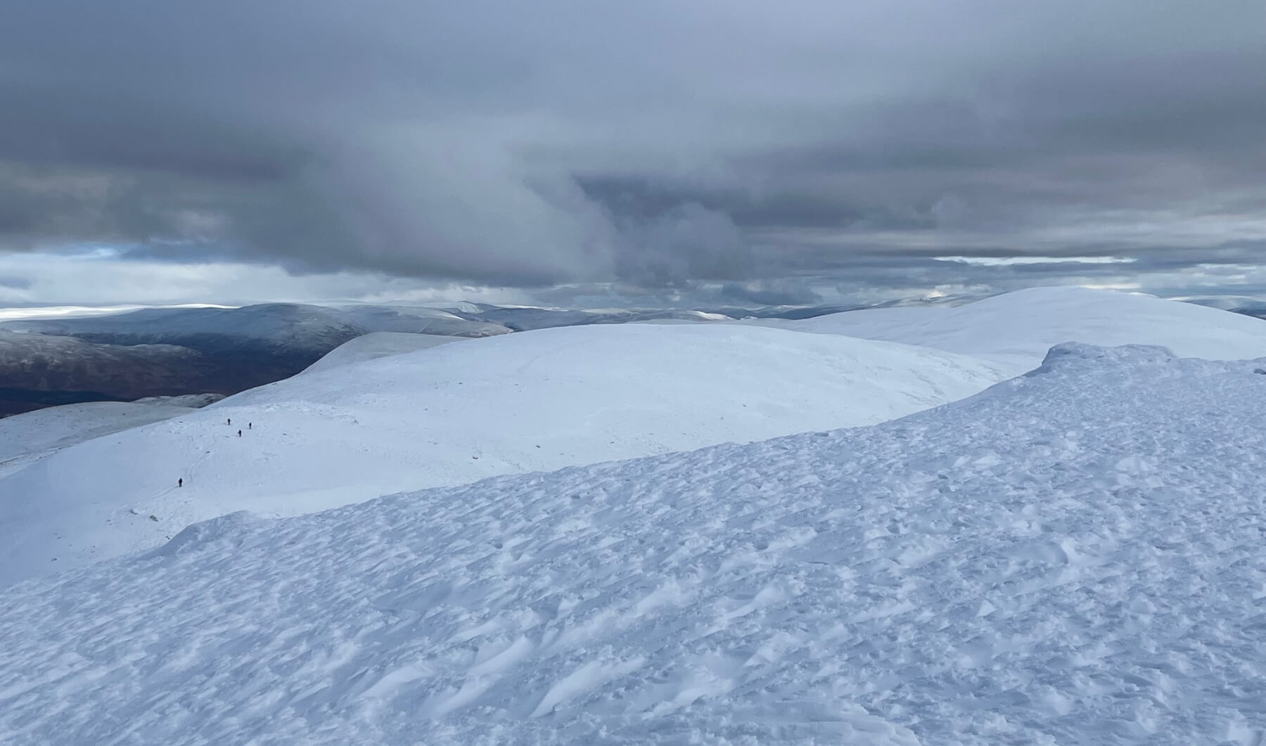 Carn Liath plateau and a few walkers maximising the fast travel conditions on the firm snow surface.