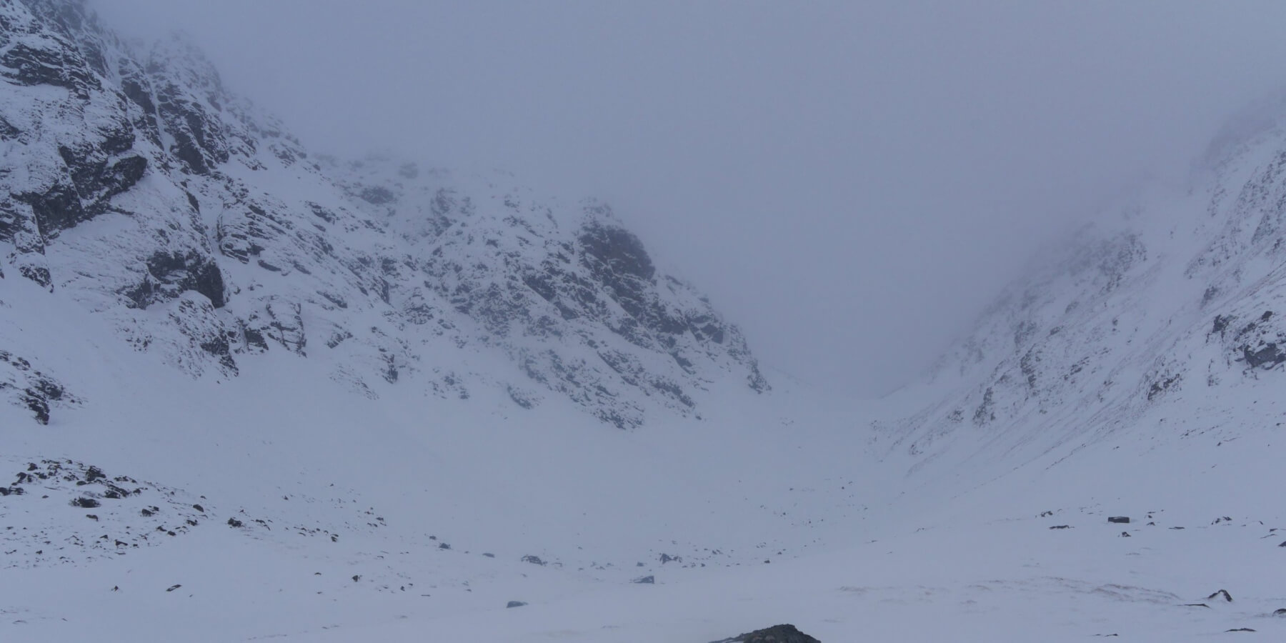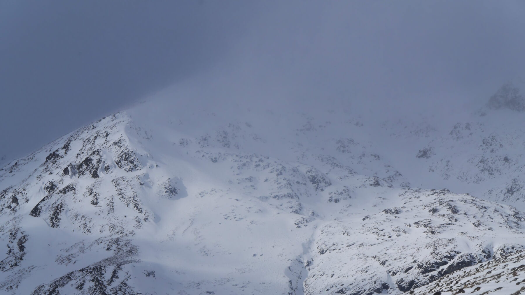 (Above) The Inner Coire of Coire Ardair with The Window right of centre. About as much snow as I have seen all season on the approach to the summit of The Window. Frequent spindrift avalanches from the NNE-facing crags whilst I was in the vicinity this morning.