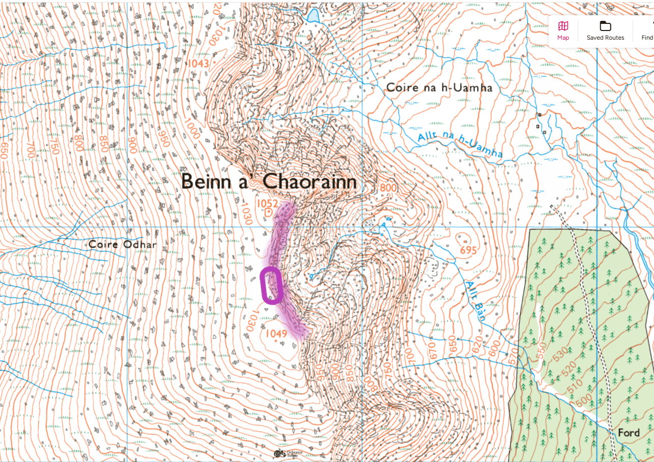 (Above) Beinn a Chaorainn’s notorious cornice line, in purple. Circled is the accurate location of where the cornice is particularly large. You’ll want to be well back and on solid ground if traversing this part of the mountain.