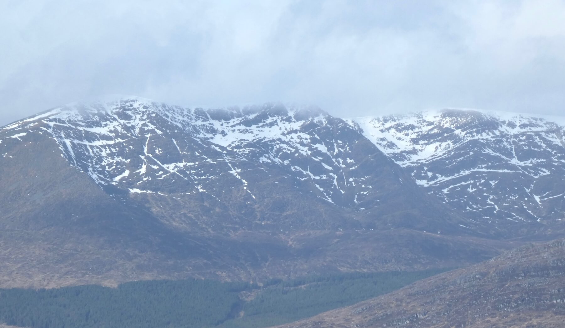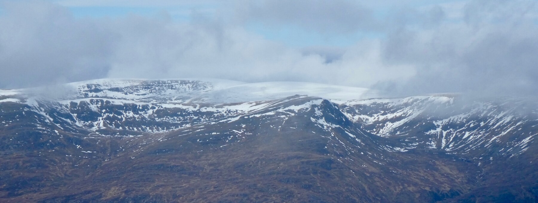 Creag Meagaidh plateau seen from afar. Coire Choille-rais is the coire seen on the righthand side of the image. The plateau still has extensive snow cover.