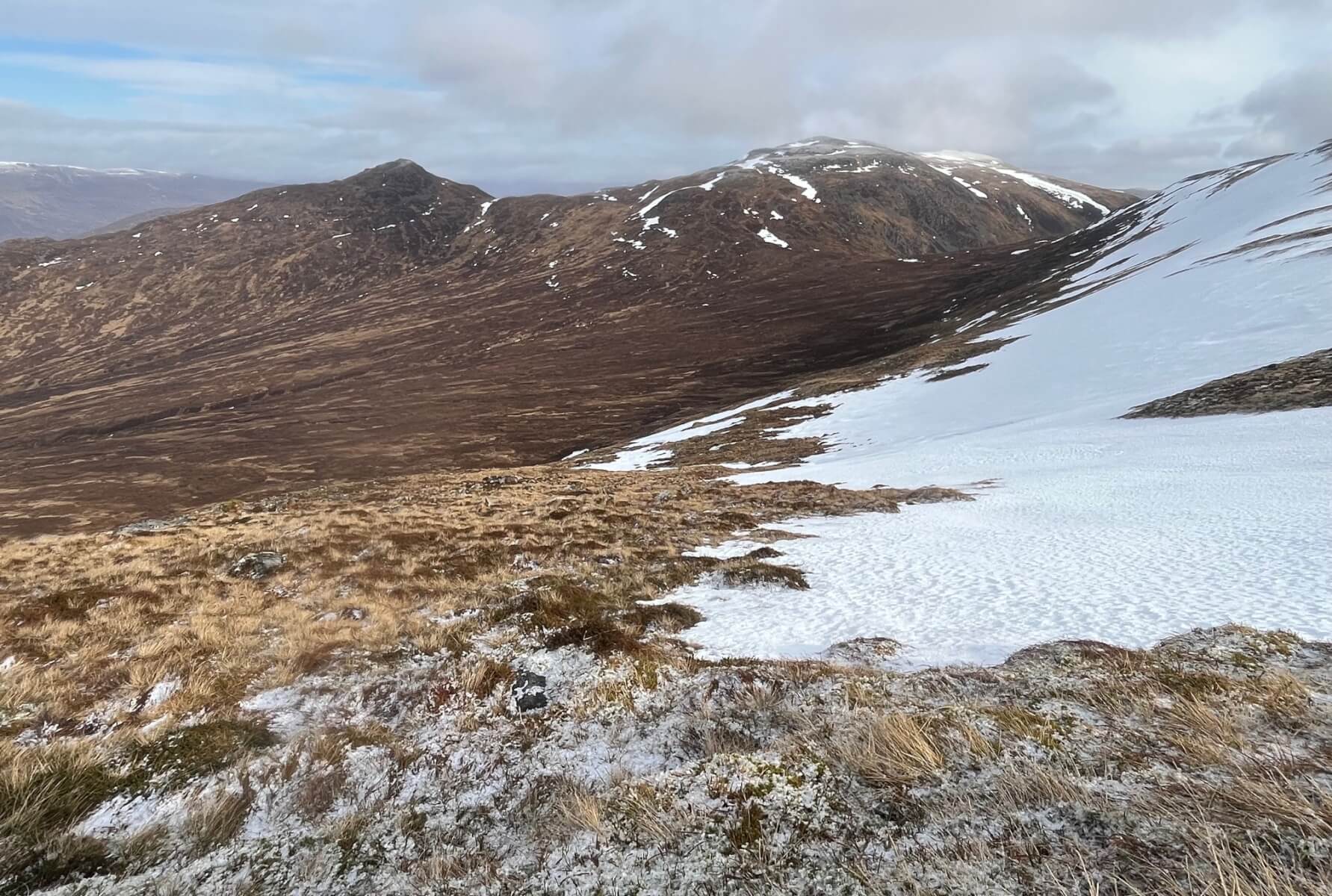 Creag Pitridh (924m) and Geal Charn (1049m) with the fresh trace of new snow in the foreground. There was evidence of fresh snow as low as 650 metres but you had to look hard to find it! Much of this disappeared throughout the day.