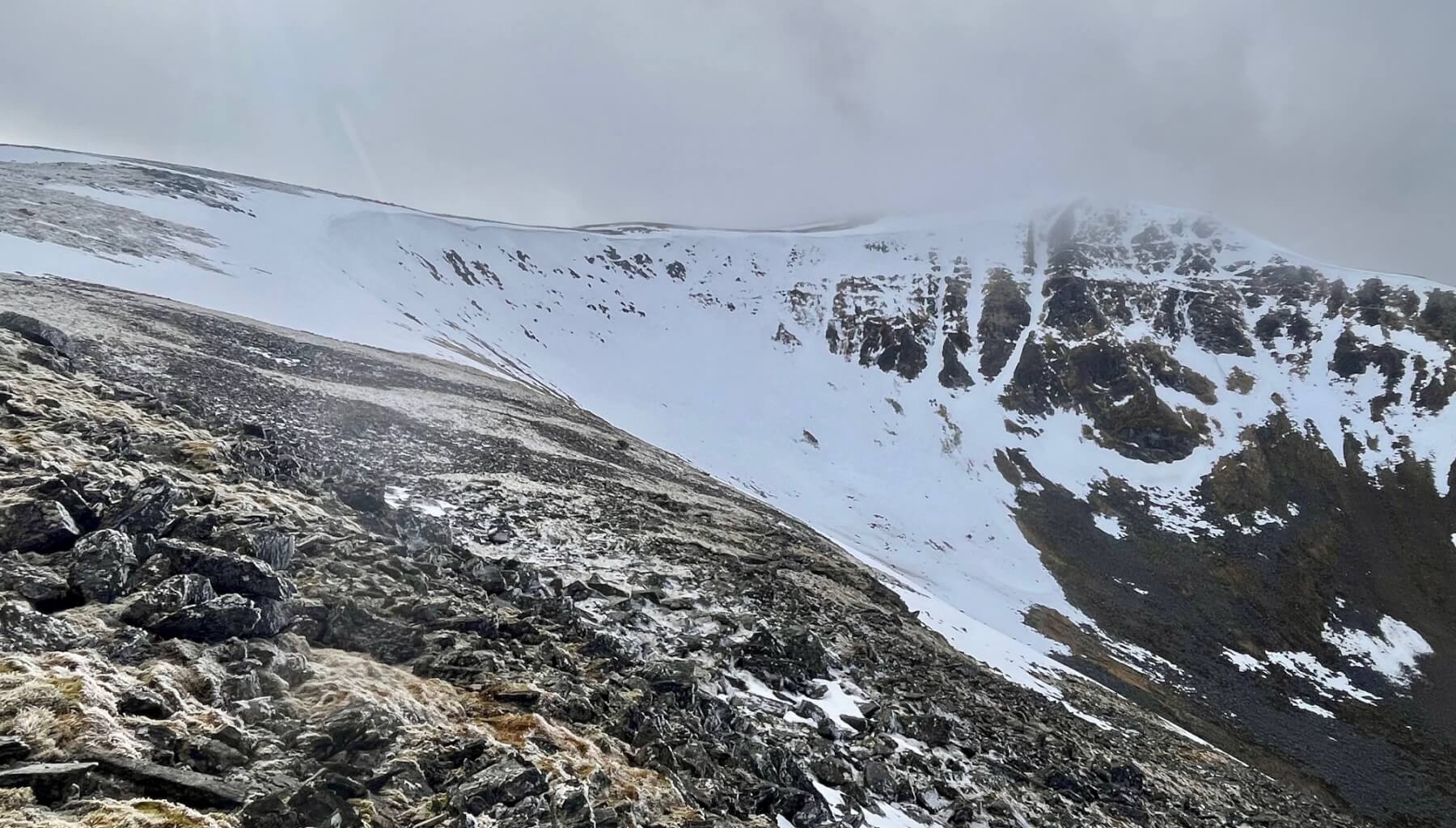 Coire Mor a’Chlachair still holding plenty of snow on its back wall which faces North-West through to North-East. The snow here extends down to about 870 metres.