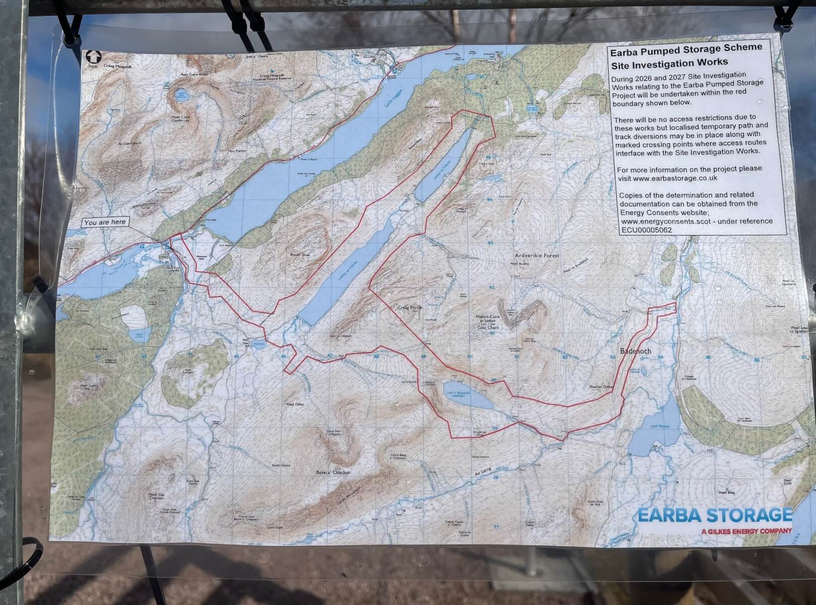 No snow here apart from the few patches in the top right which are on a north facing aspect at about 600 metres. The new track for the Earba Pumped Storage Scheme can be seen on the righthand side of the loch.