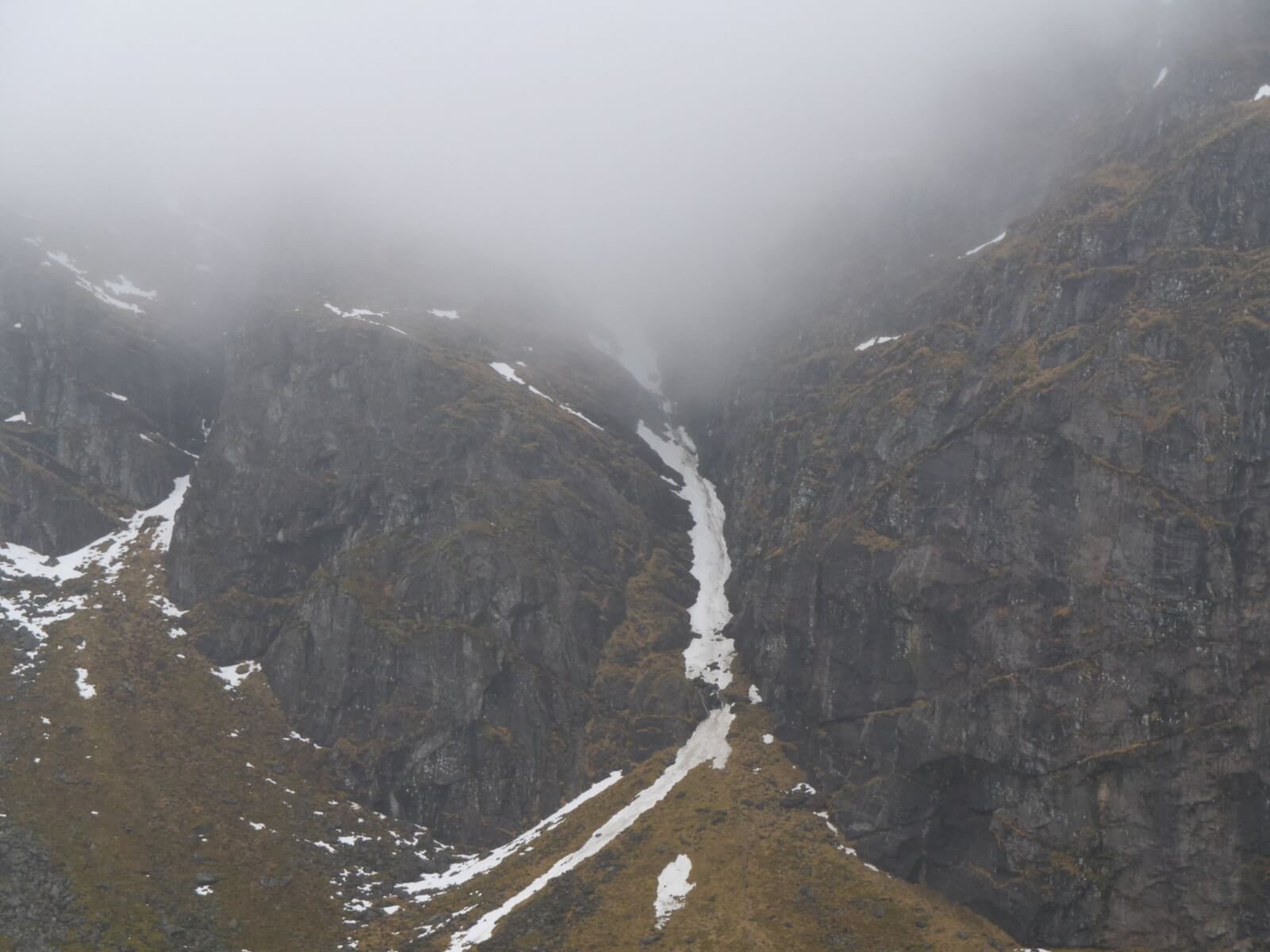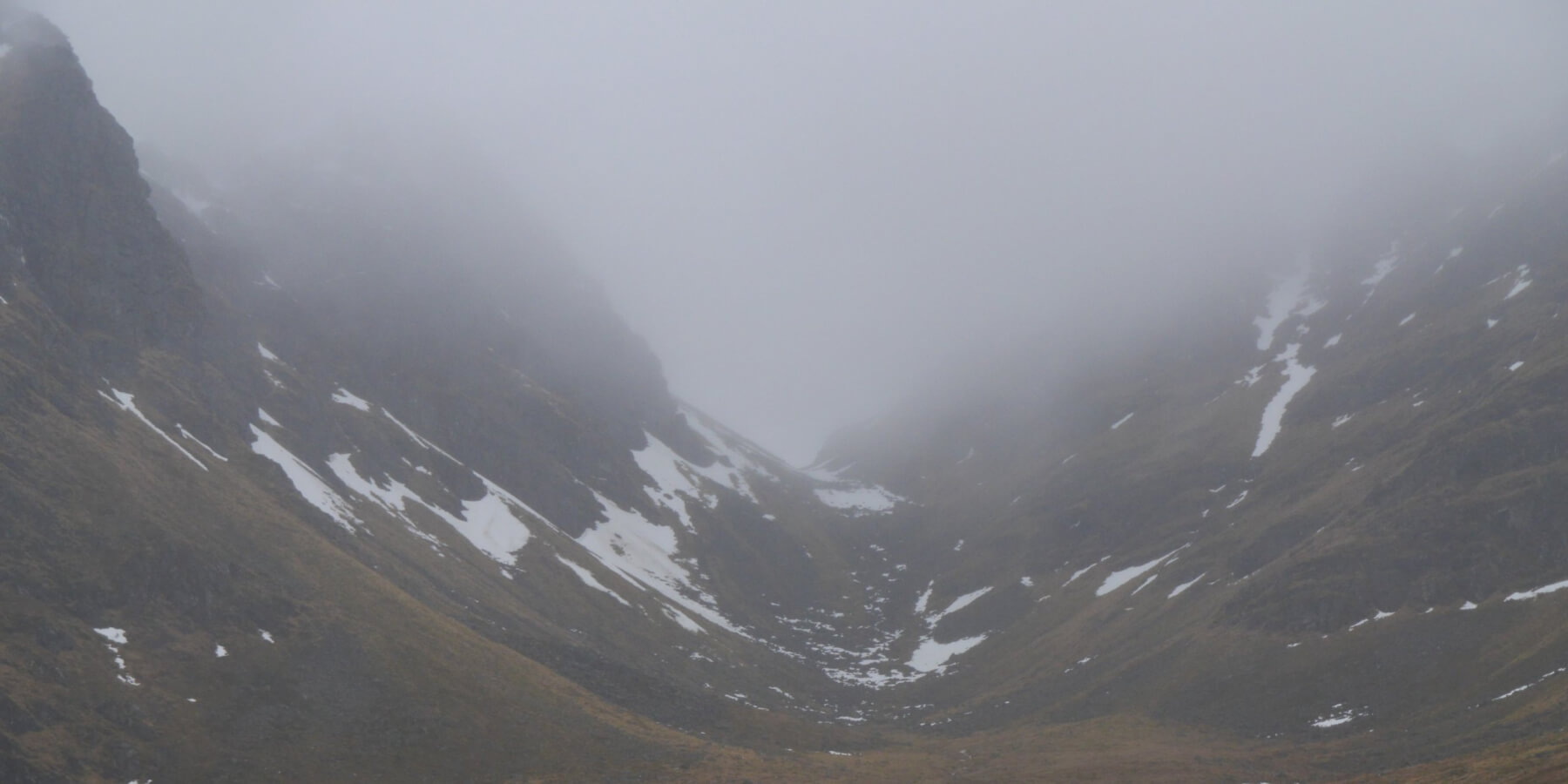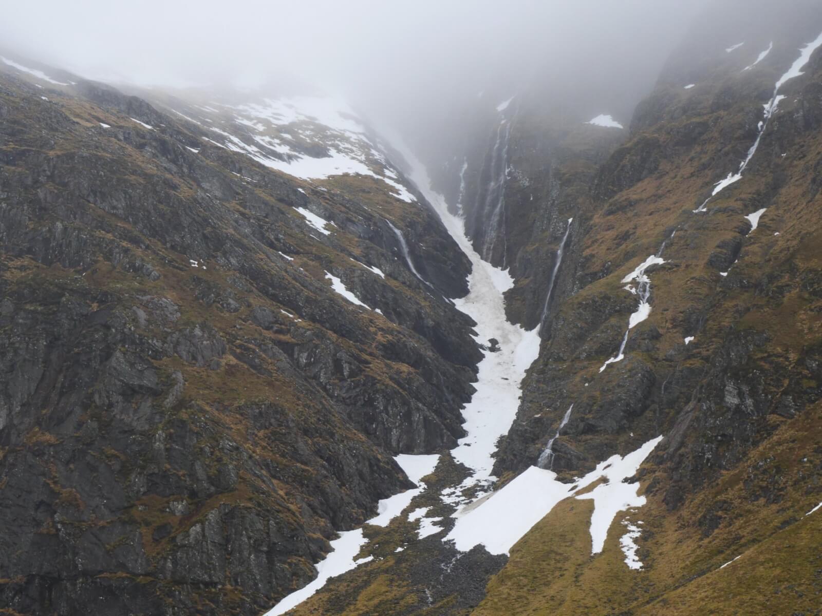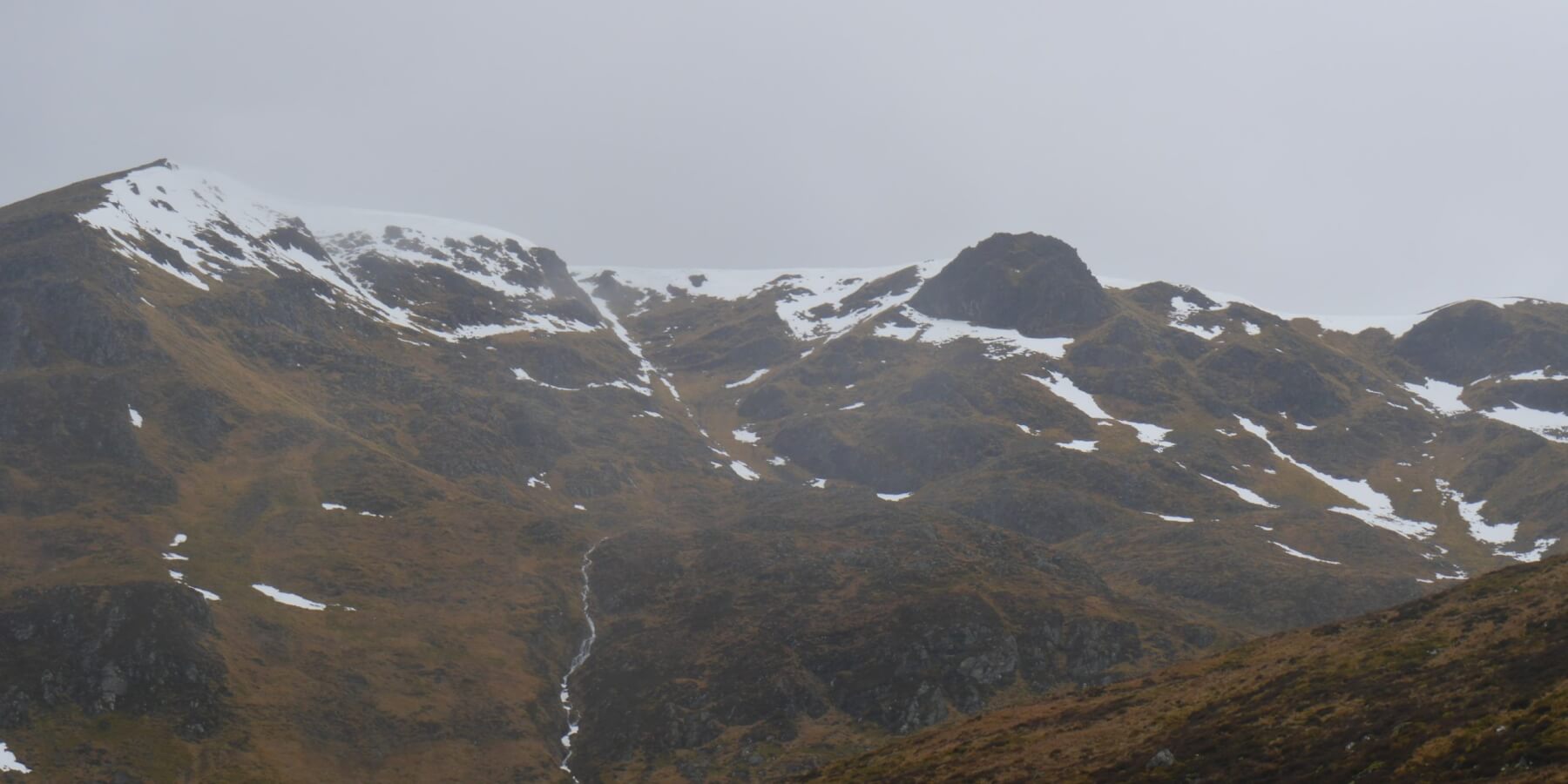 (Above) Limited snow cover on the E and ESE aspects of Coire Chriochairein. Better visibility for a time just as I was exiting.