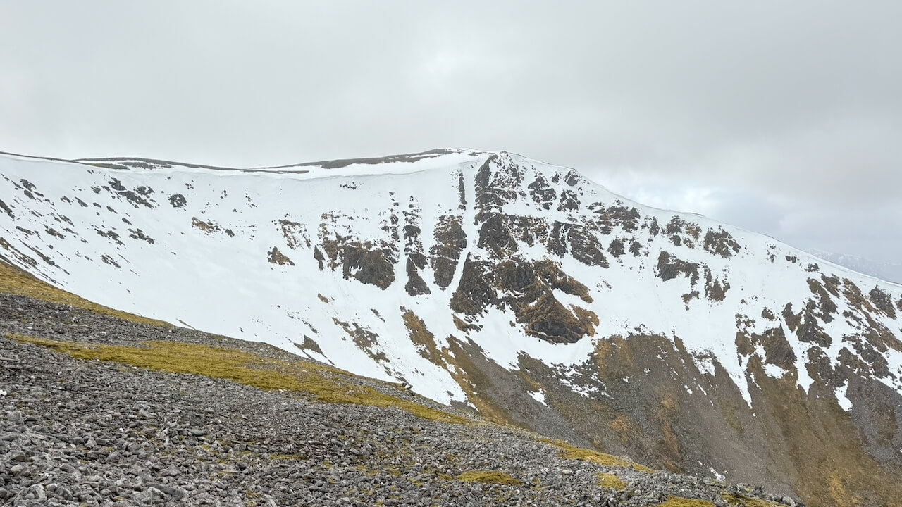 A very wet start to the day which thankfully cleared up late morning to give a very fine day with clear views of the surrounding hills. Any lying snow, sometimes large and steep fields in the backs of coiries will become very firm overnight as the freezing level lowers. Mostly these snowy areas are avoidable but just giving a heads up if any plans include snow approaches as crampons and axes would be required. Be prepared for another wintry blast next week with snow to lower levels expected Thursday!