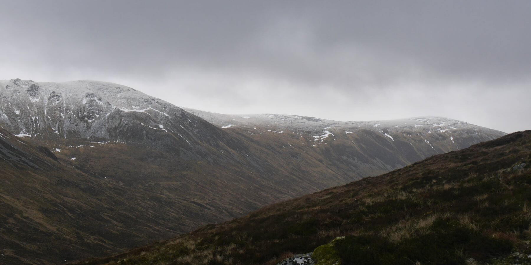 (Above) Unprepossessing shot of Sron Coire a Chrochairein left and Carn Liath far right plus its associated plateau area. Lacking in scenic glamour – definitely – but does illustrate where we had snow down to overnight – circa 800m.