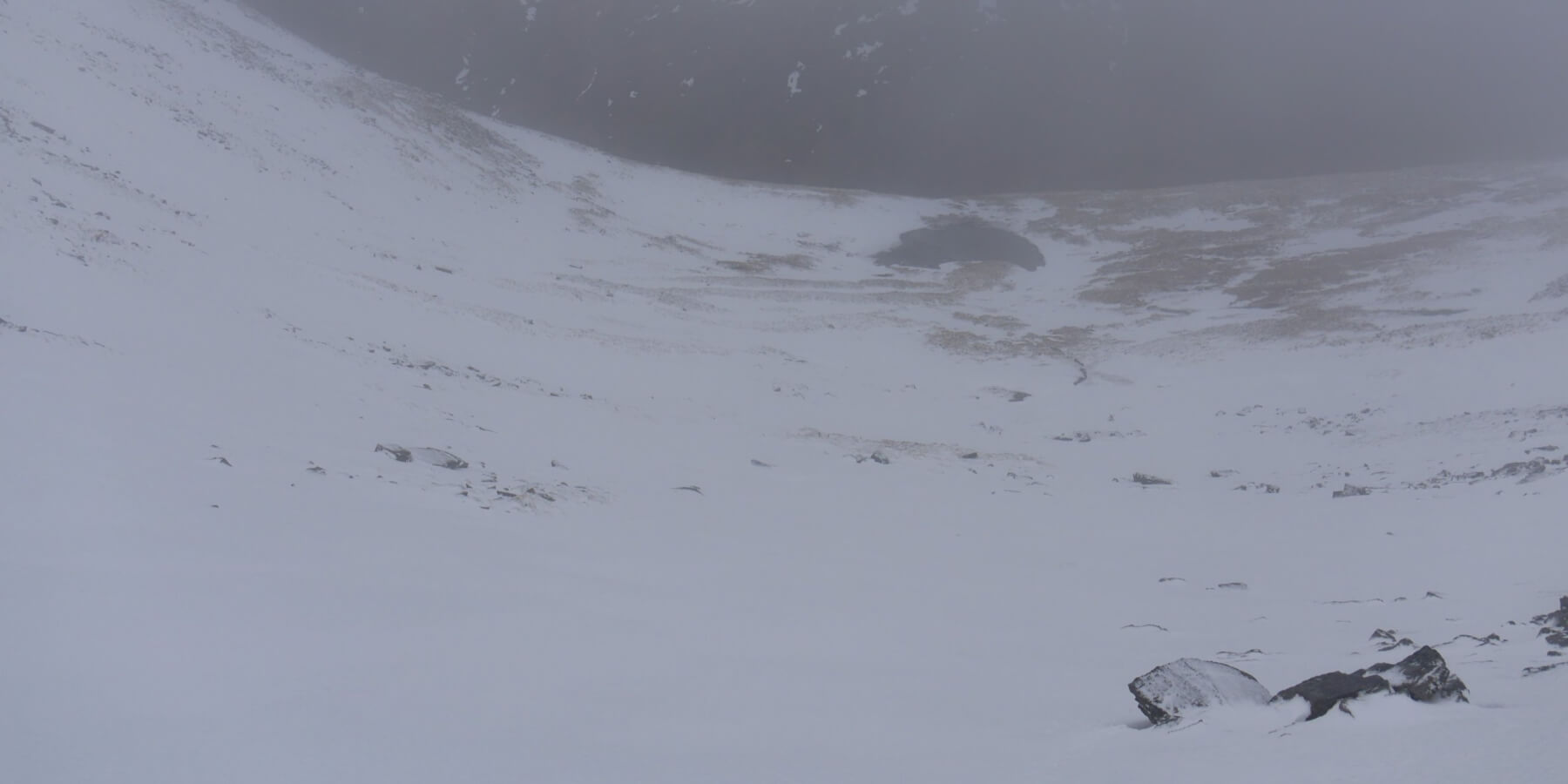 (Above) Looking out from the entrance to Coire nan Gamhna toward the Post Face of Coire Ardair, Lochan a Choire and the Inner Coire – with The Window lurking in the mist beyond.