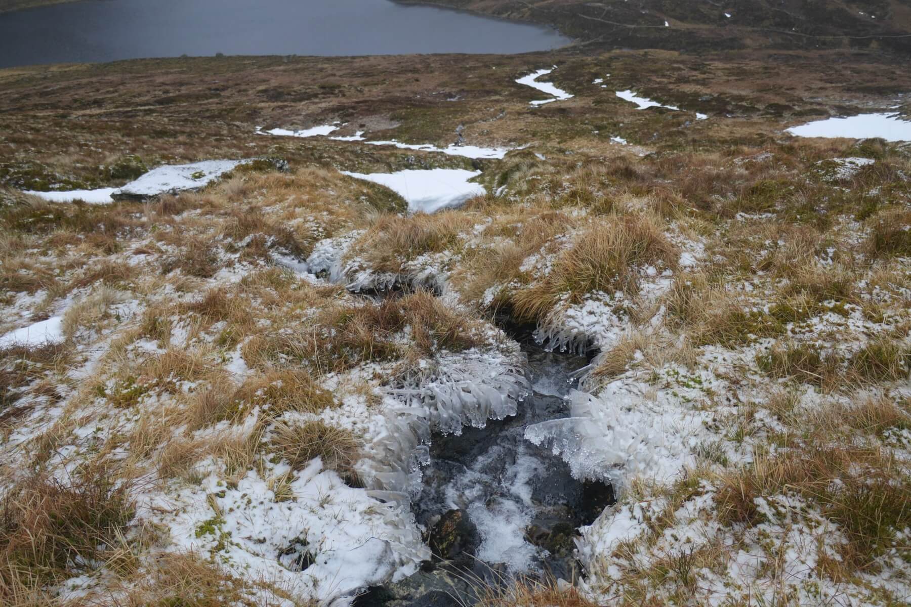 (Above) Approx midday. Still winter-like with water ice fringing some burns at 700m, and frozen turf, too.