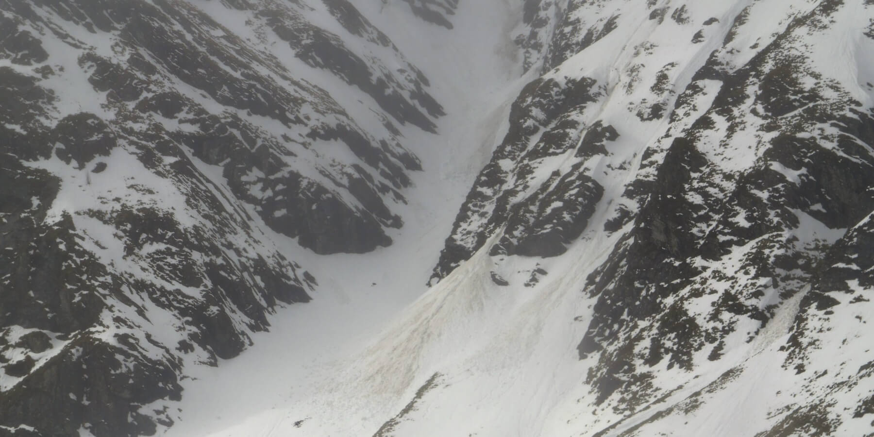 (Above) The bottom of Easy Gully. Recent avalanche debris below South Post, Centre Post, and Staghorn Gully extreme right.