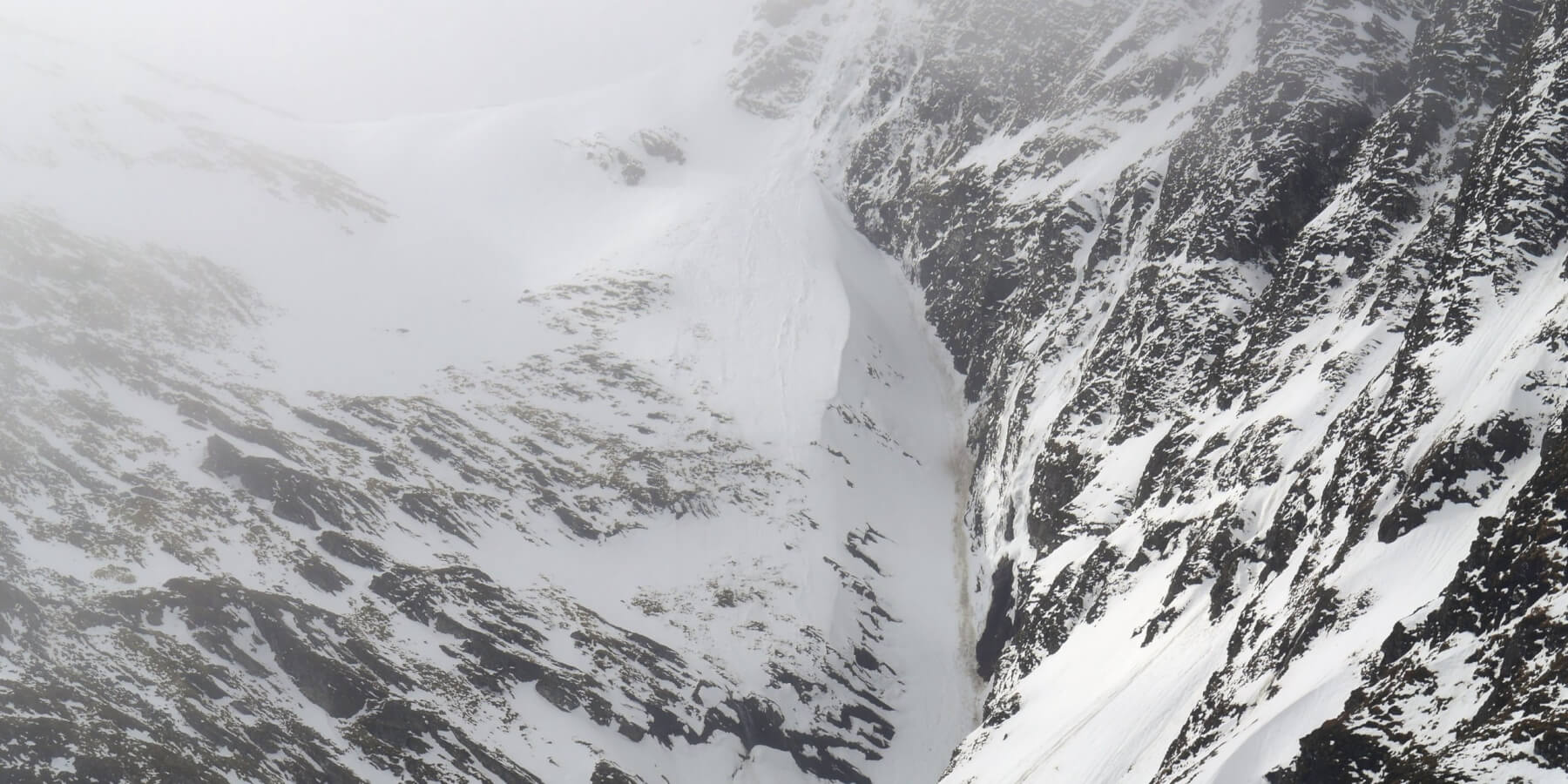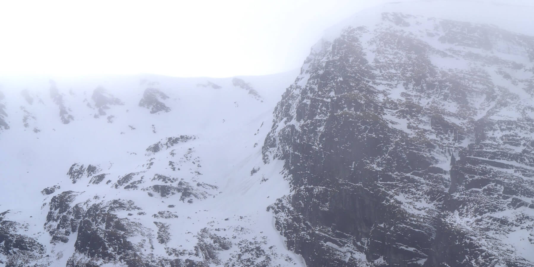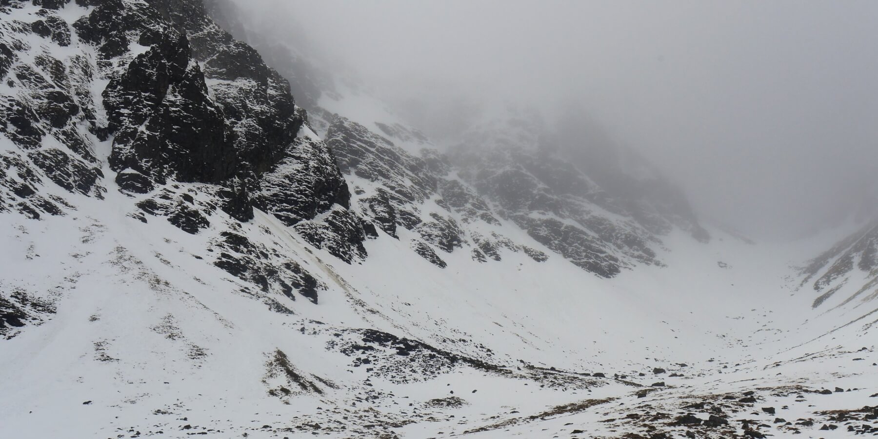 (Above) The Inner Coire of Coire Ardair – The Window in mist extreme right. A fair amount of debris on the crag apron from a couple of avalanche events.