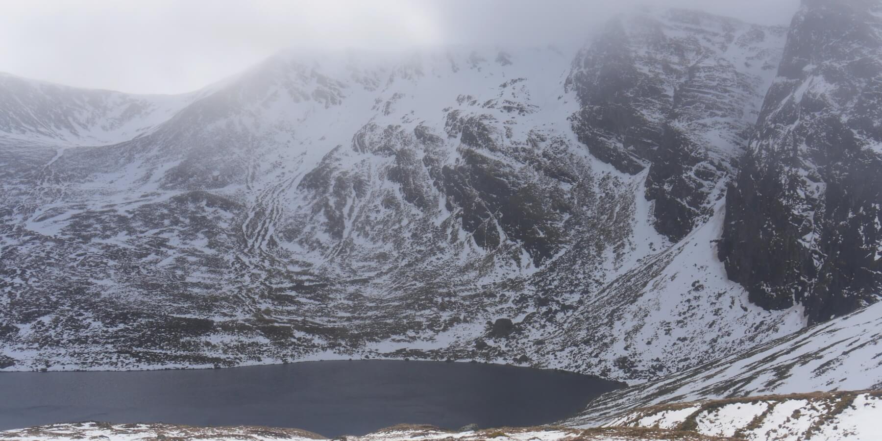 (Above) Looking down to Lochan a Choire from the Inner Coire. Recent avalanche debris just visible low in Raeburn’s Gully far right.