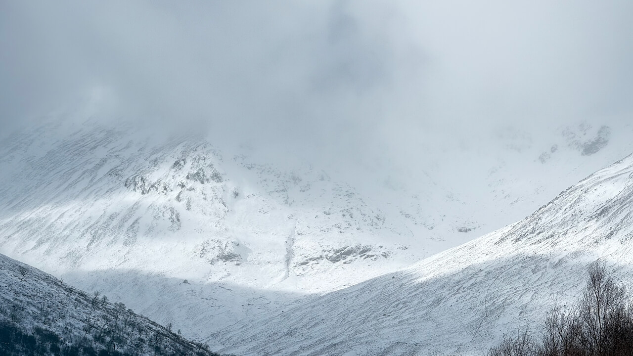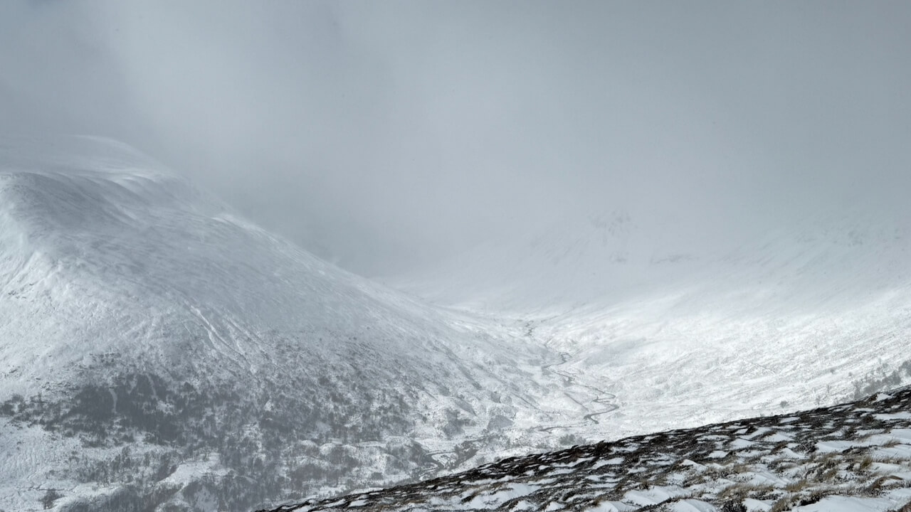 Looking toward the cliffs of a stormy Creag Meagaidh