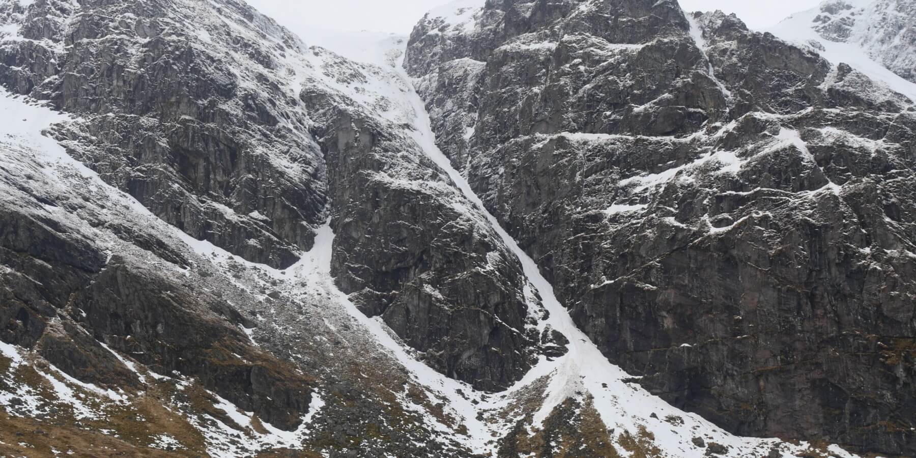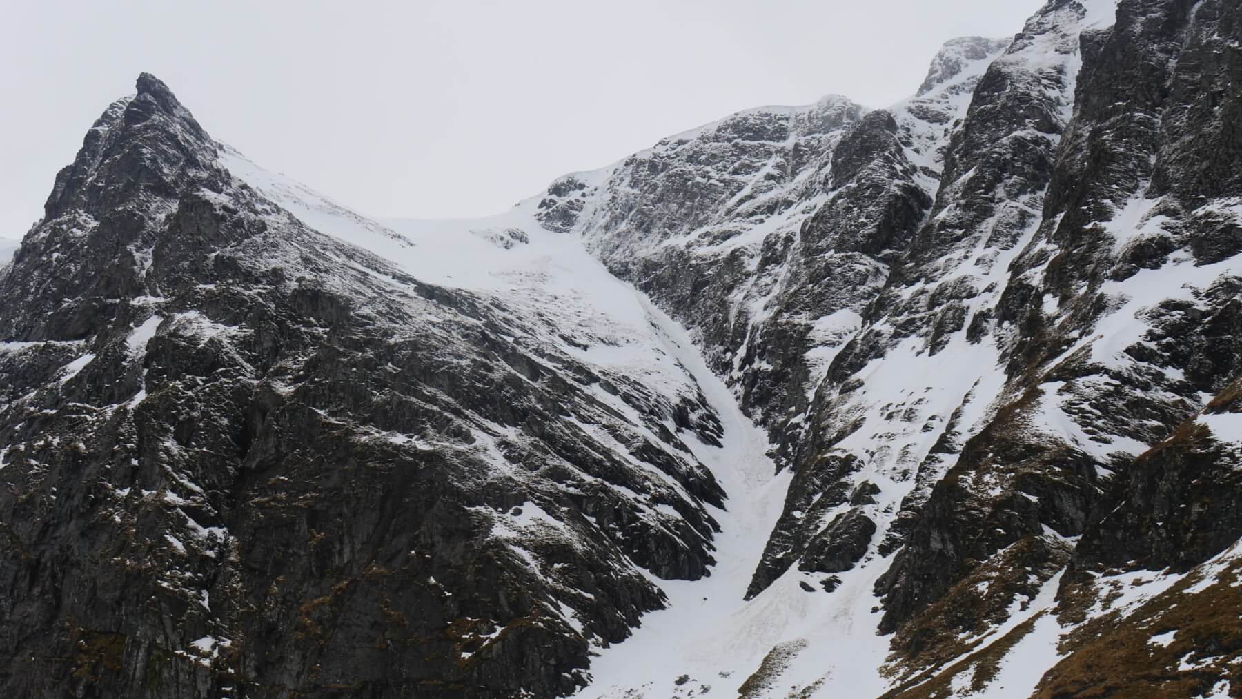 (Above) Easy Gully and the Post Face of Coire Ardair. The site of now quite old avalanche and cornice debris.
