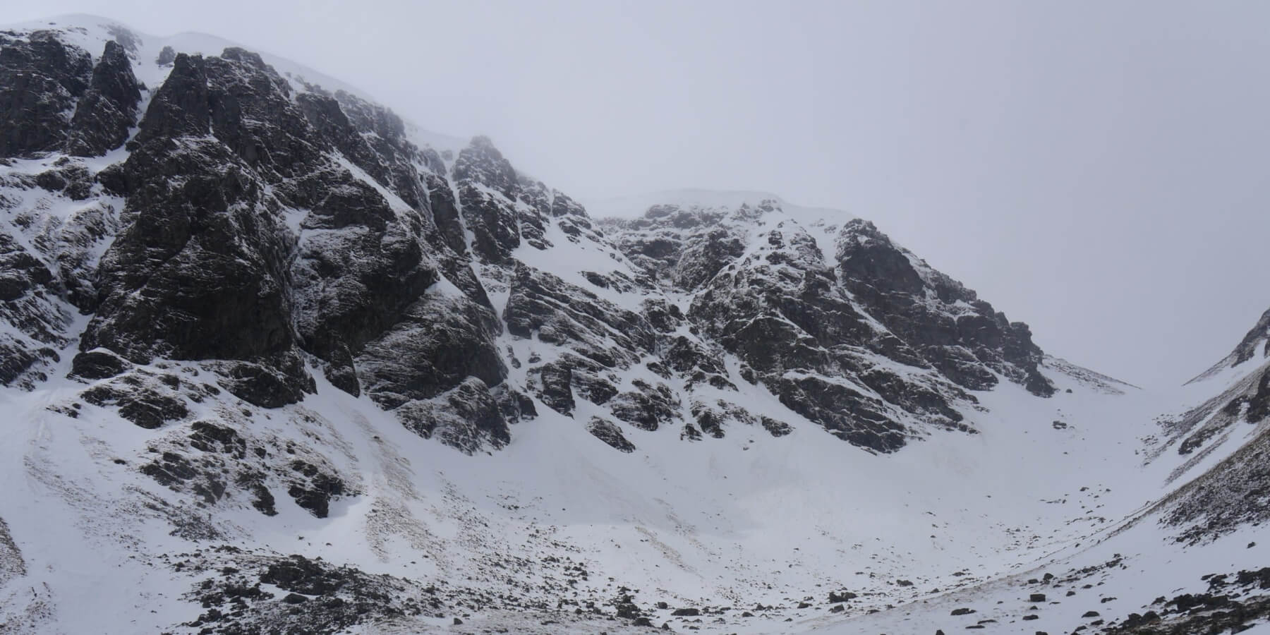 (Above) The NNE-facing crags of the Inner Coire, and The Window far right. The approach to The Window expected to get much firmer, if not icy, overnight in addition to new windslab build up.