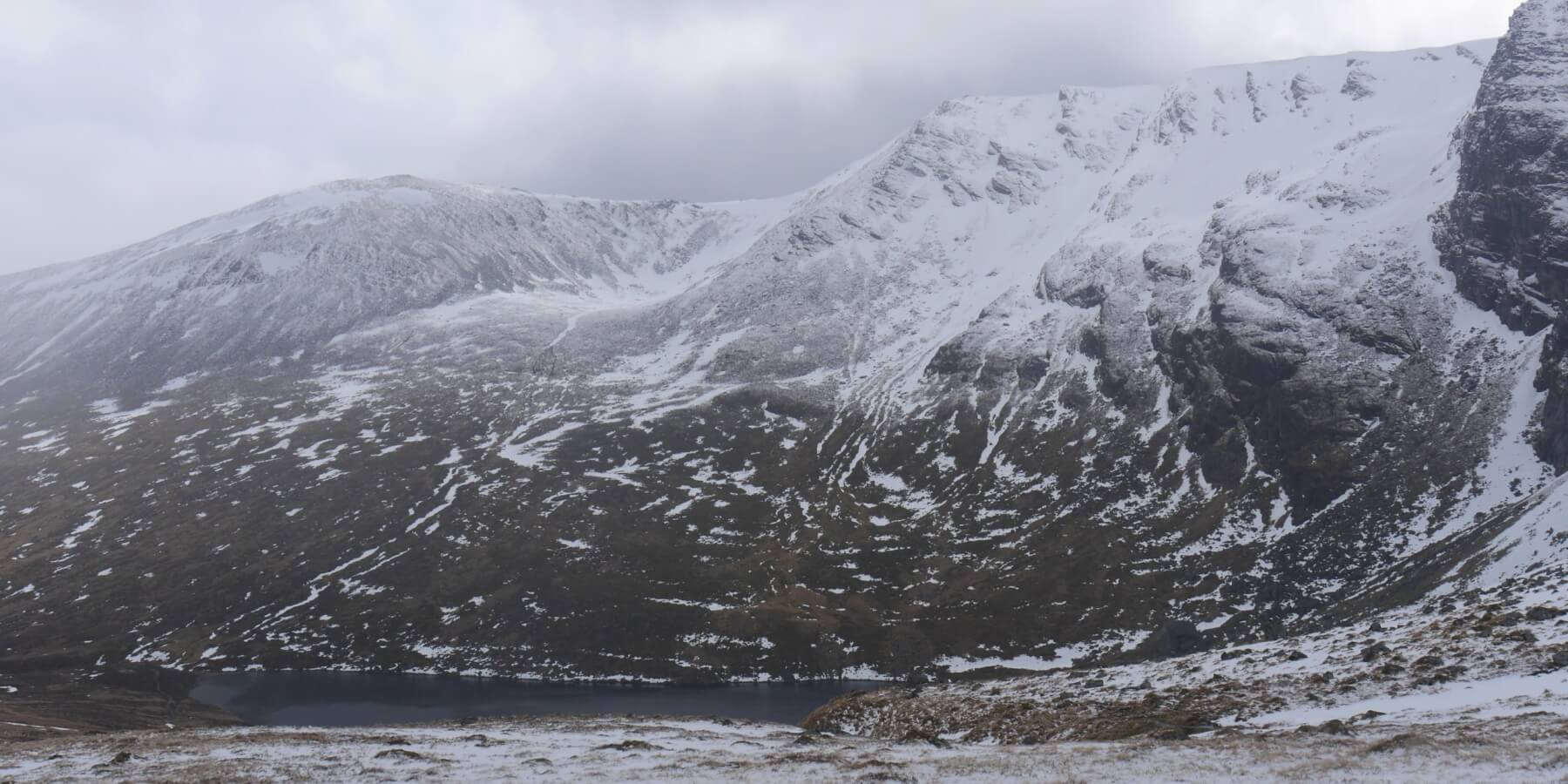 (Above) Looking out of the Inner Coire across to Lochan a Choire and Coire nan Gamhna. Overnight cover of fresh snow down to 750m in our area.